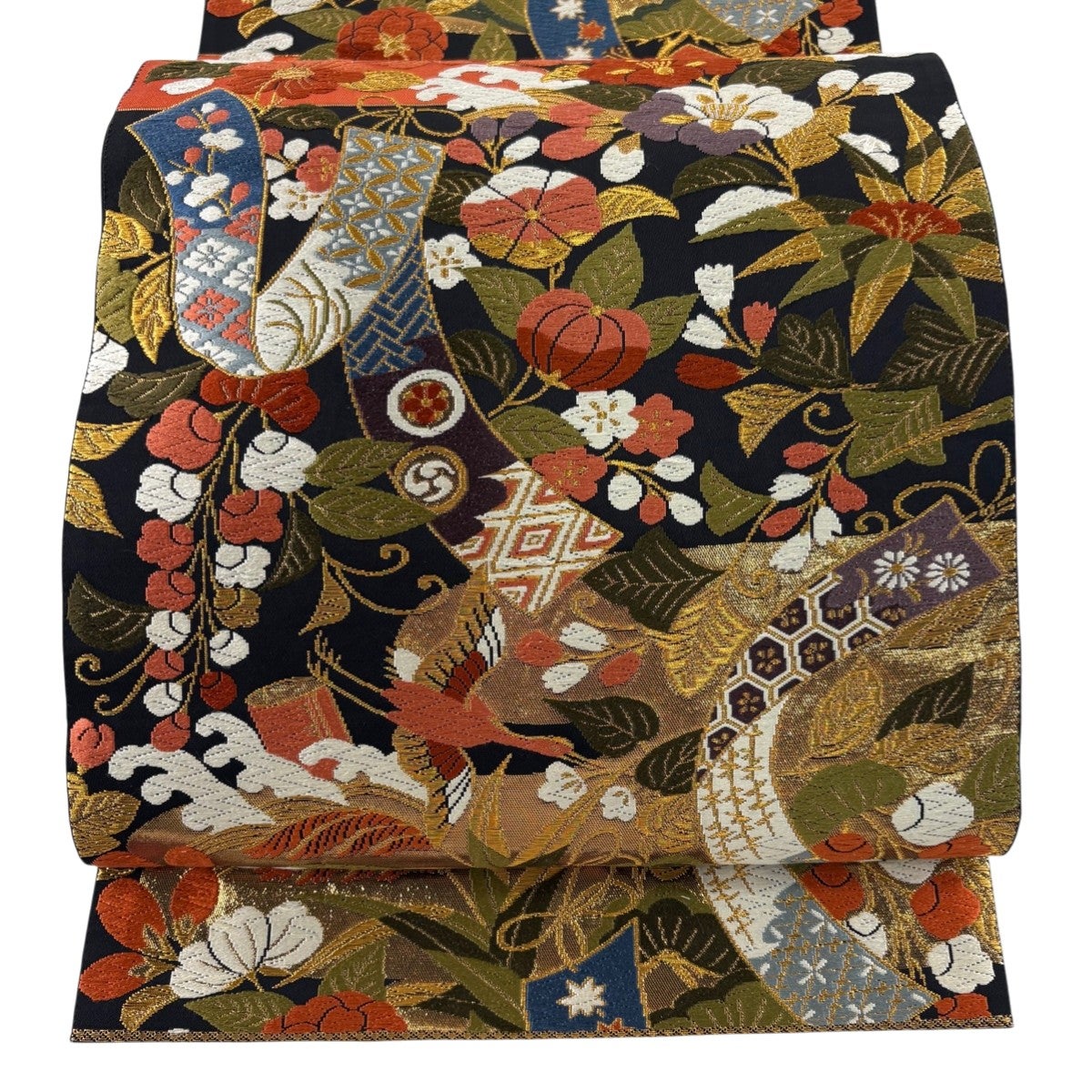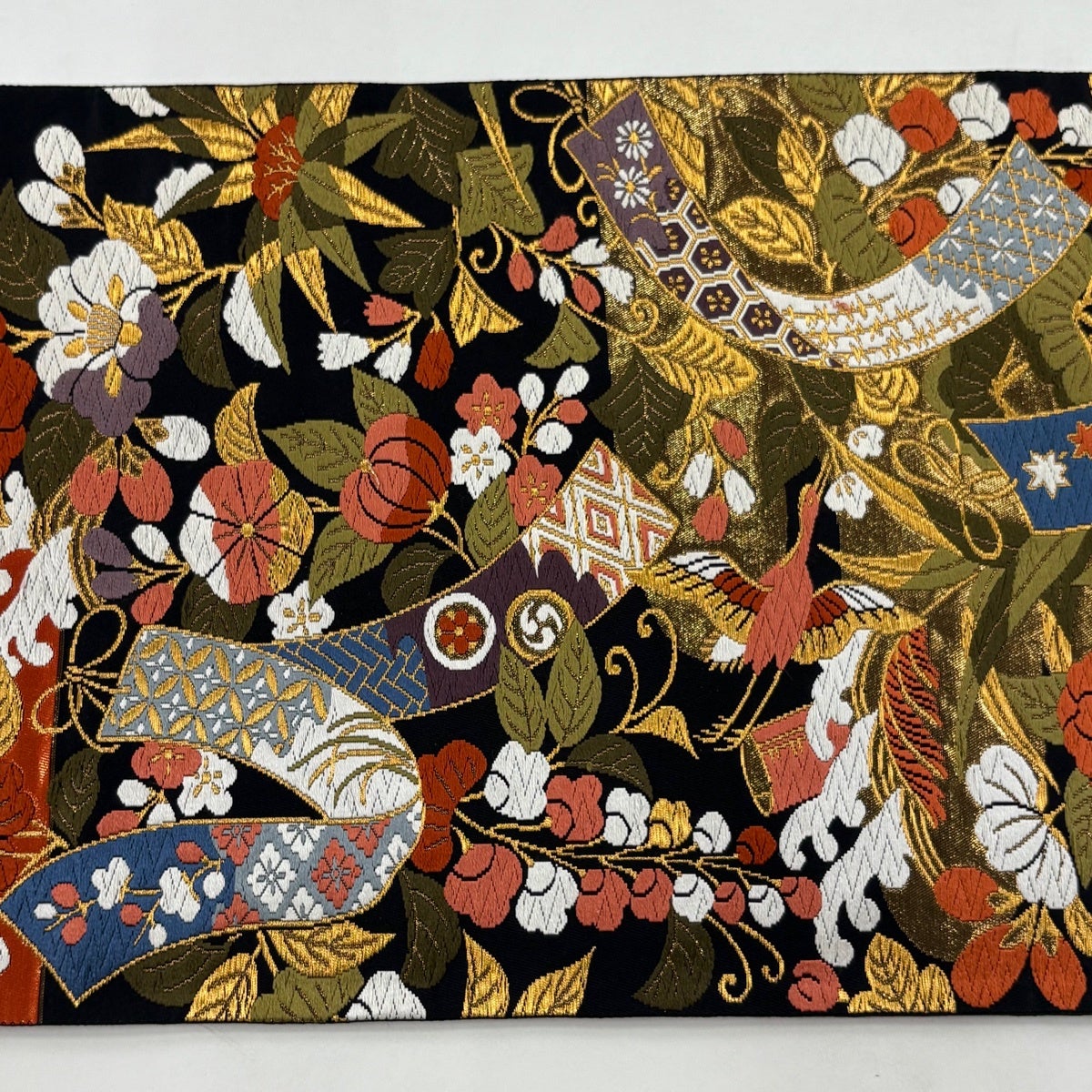 袋帯 秀品 正倉院彩文 花鳥 色紙 箔 唐織 黒 六通 正絹