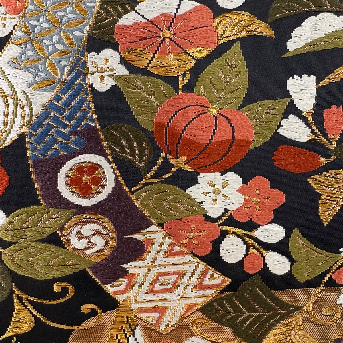 【美品】 袋帯 秀品 桜 幾何学 金糸 箔 黒 六通 正絹