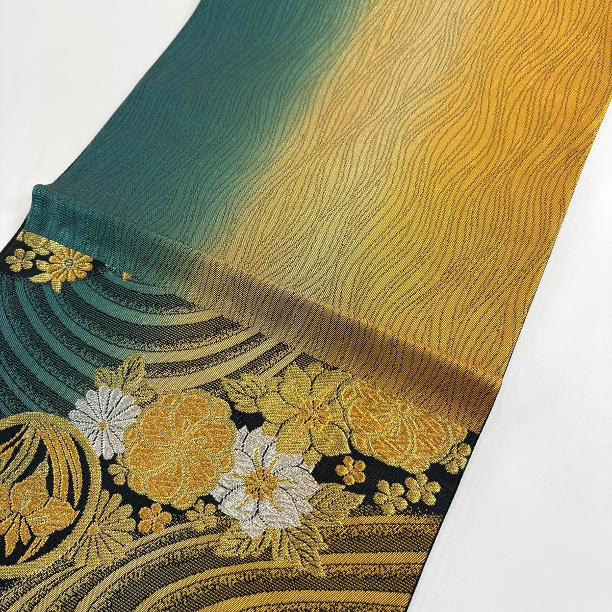 袋帯 秀品 振袖向き 草花 波 金銀糸 箔 黒 六通 正絹