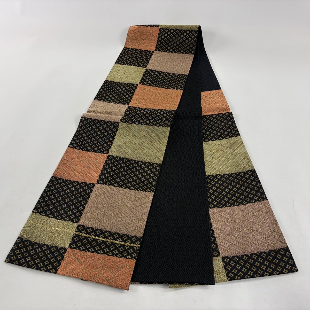【美品】 袋帯 秀品 菊 市松 金糸 箔 黒 六通 正絹