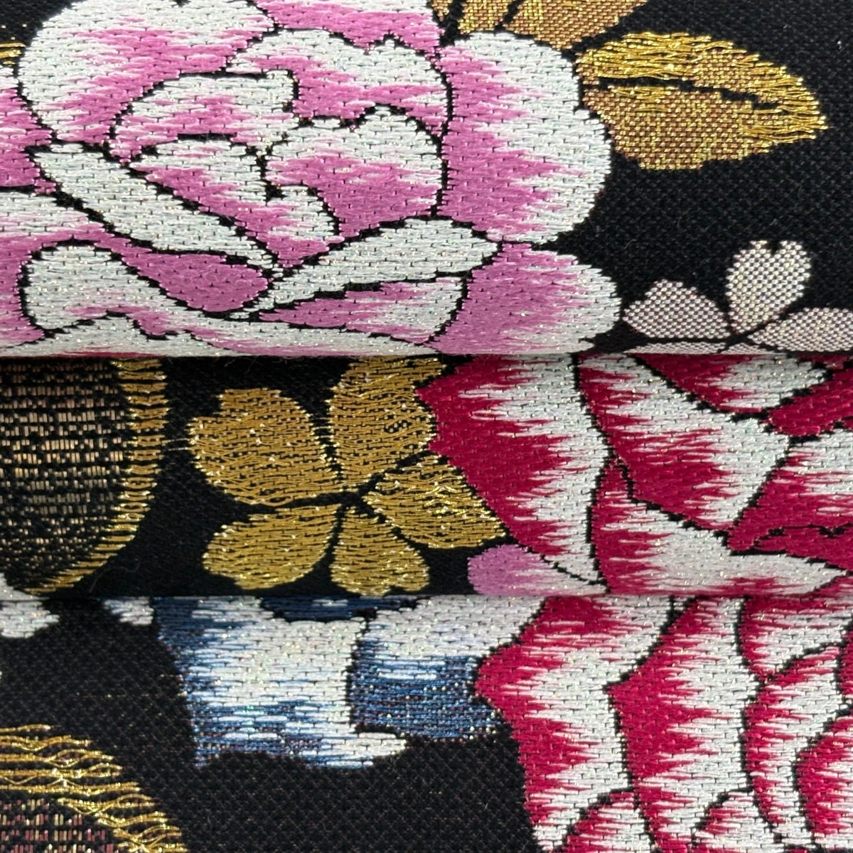 【美品】 袋帯 秀品 牡丹 蝶 唐織 箔 黒 六通 正絹