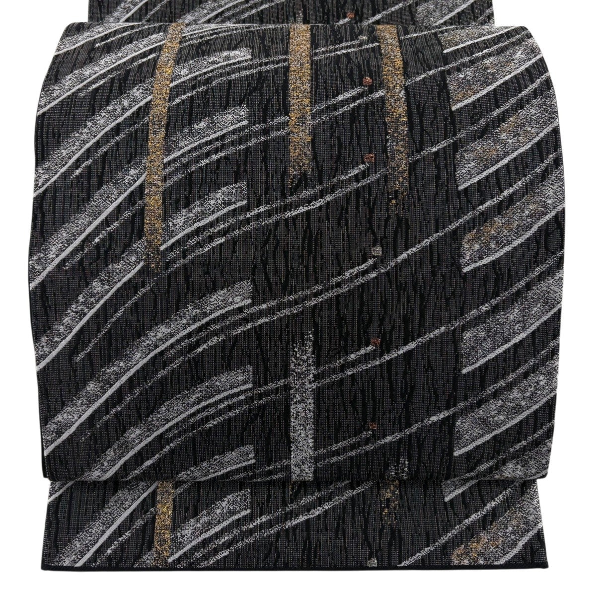 【美品】 袋帯 秀品 よろけ縞 金糸 箔 黒 六通 正絹