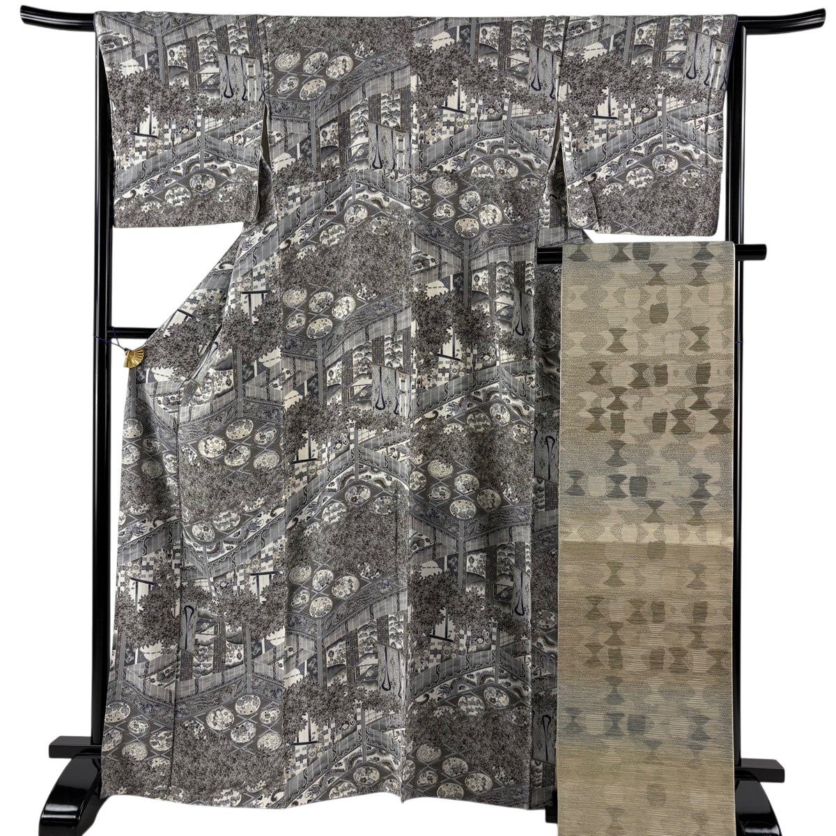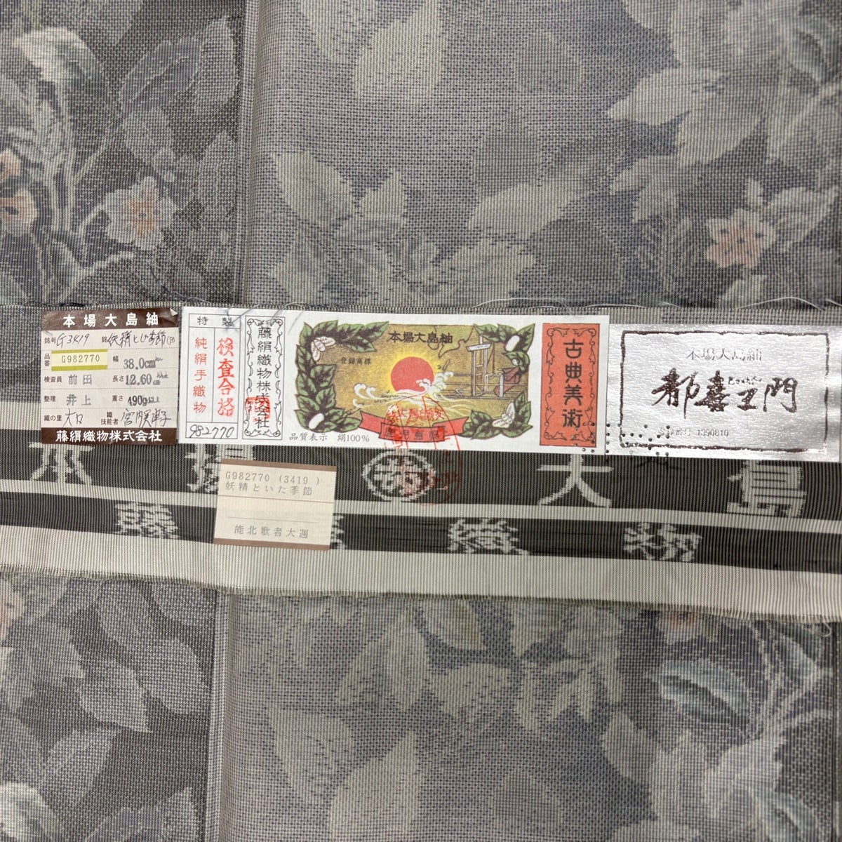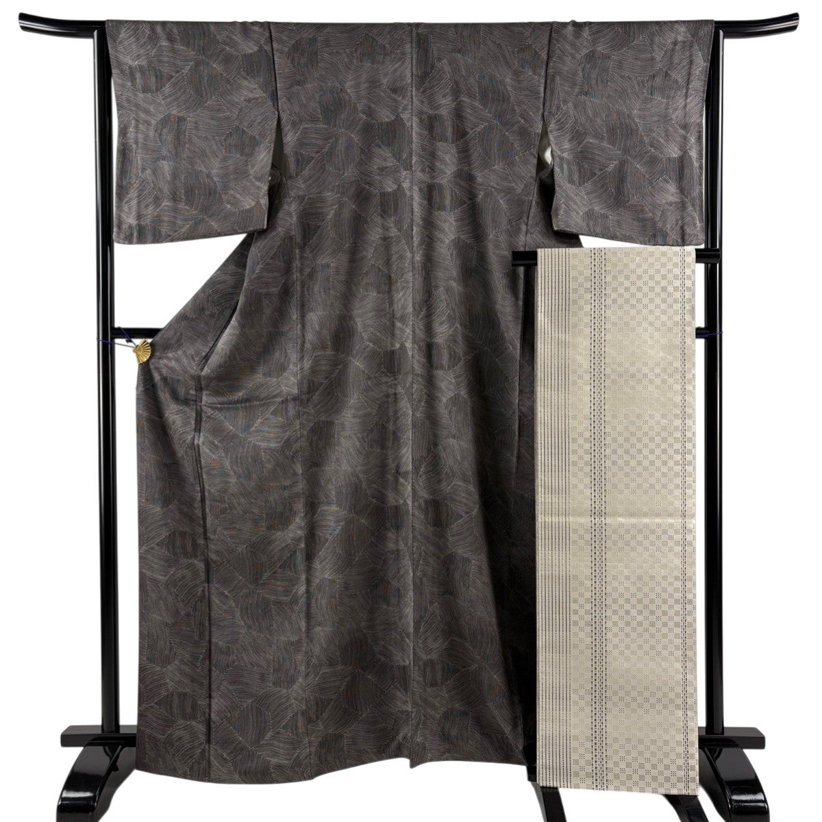 他の画像を見る 30%OFF 【美品】 大島紬 身丈166cm 裄丈66.5cm M 袷 名古屋帯セット 純泥染 証紙あり 麻の葉 笹 灰茶 正絹 名品 K30 当店通常価格 ¥ 33,800 ¥ 23,660 税込