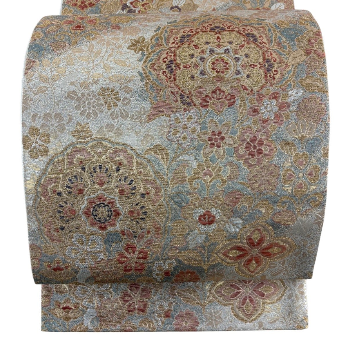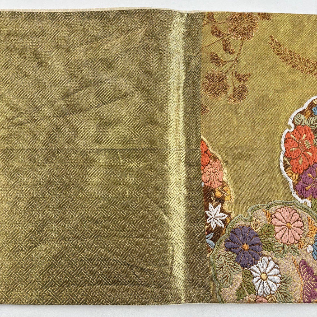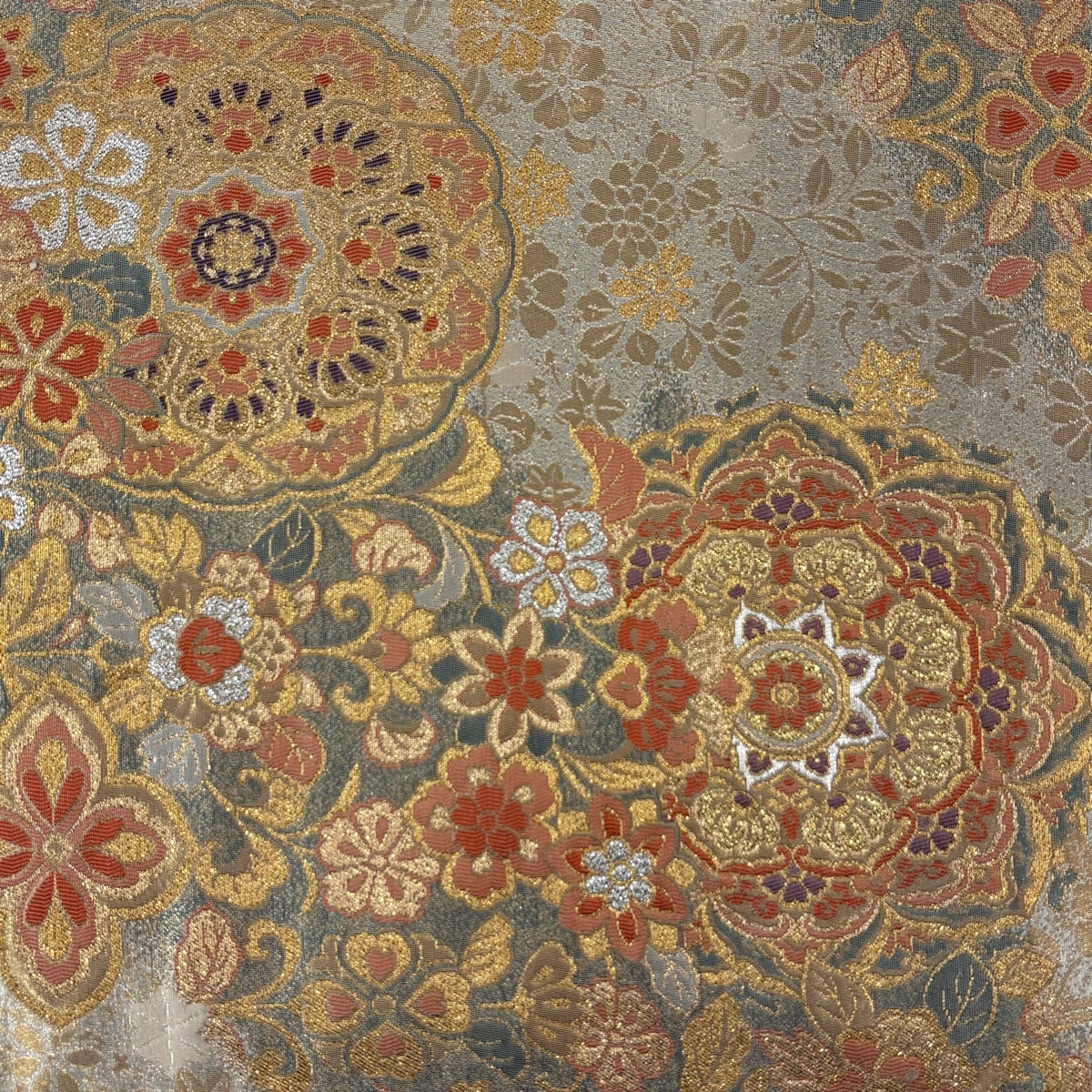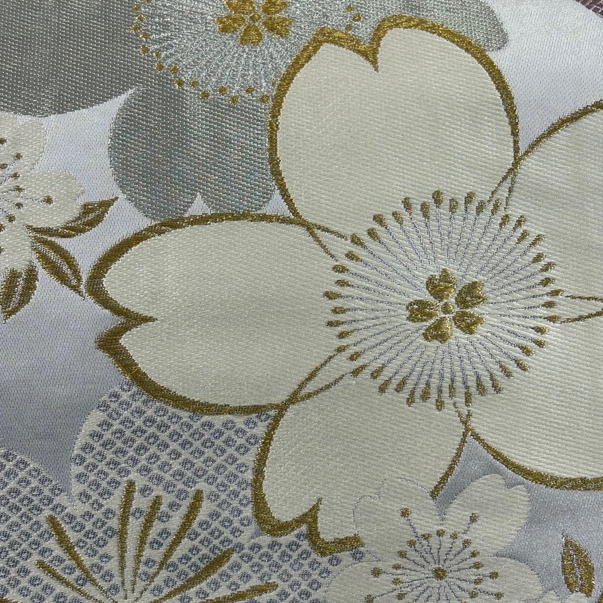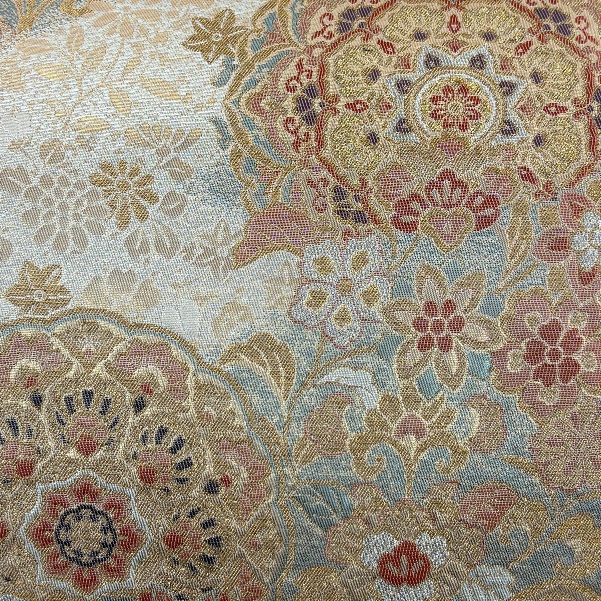 袋帯 秀品 菊 花唐草 金糸 箔 銀色 六通 正絹