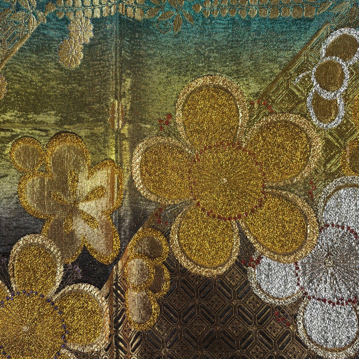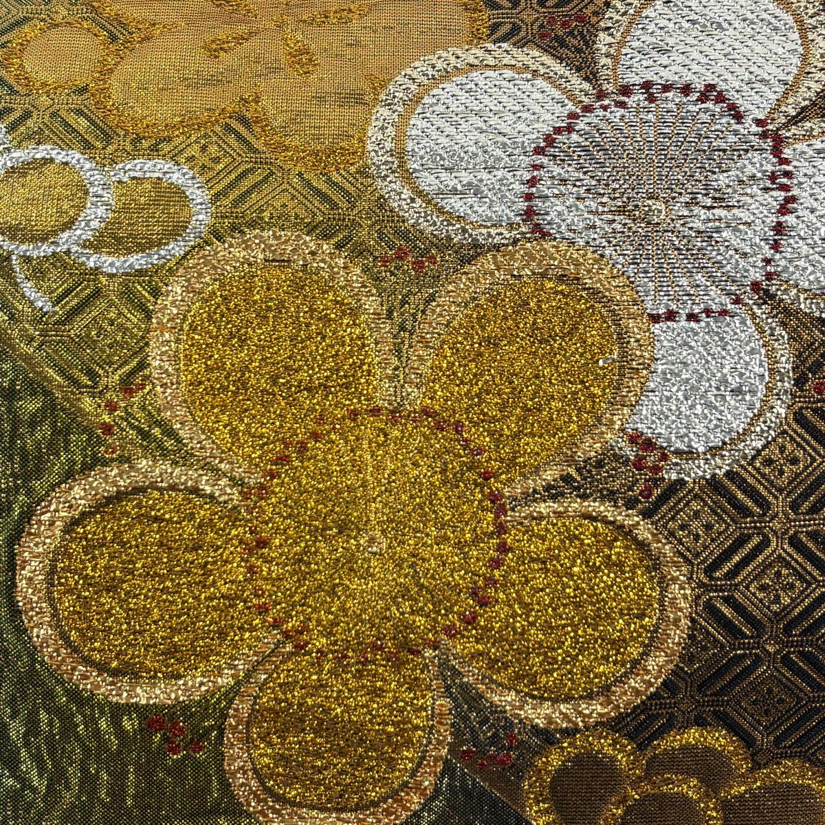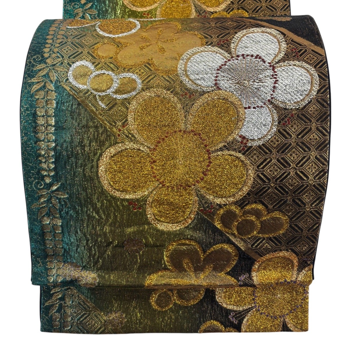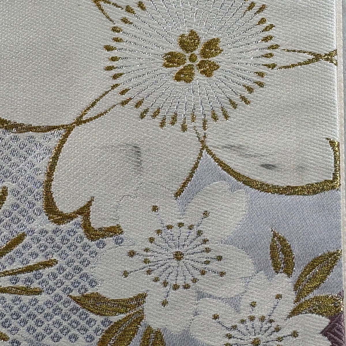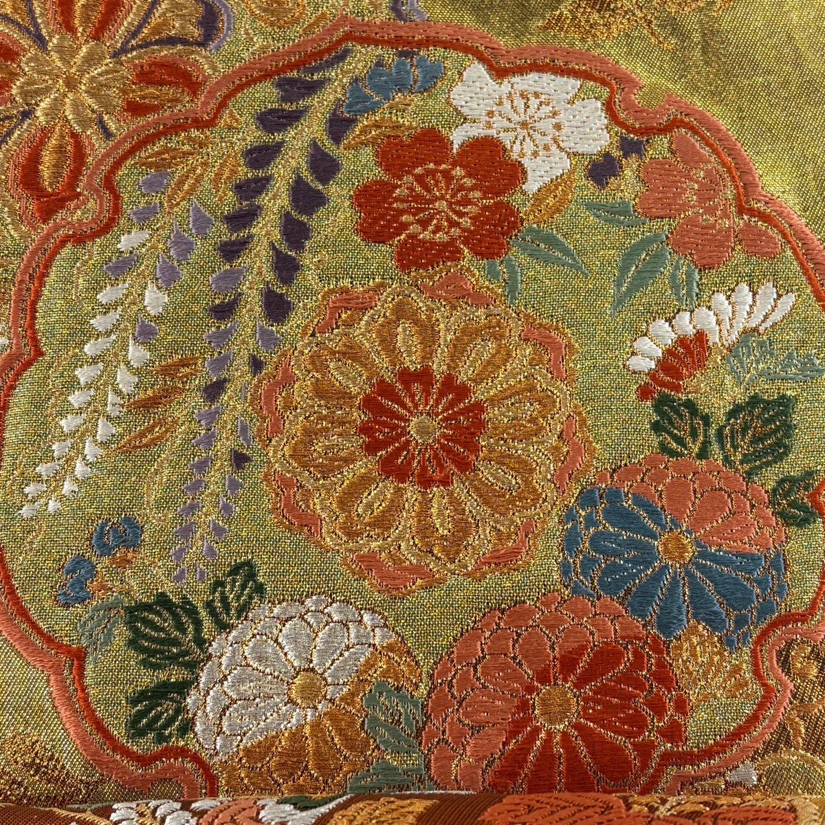 袋帯 秀品 菊 花唐草 金糸 箔 銀色 六通 正絹