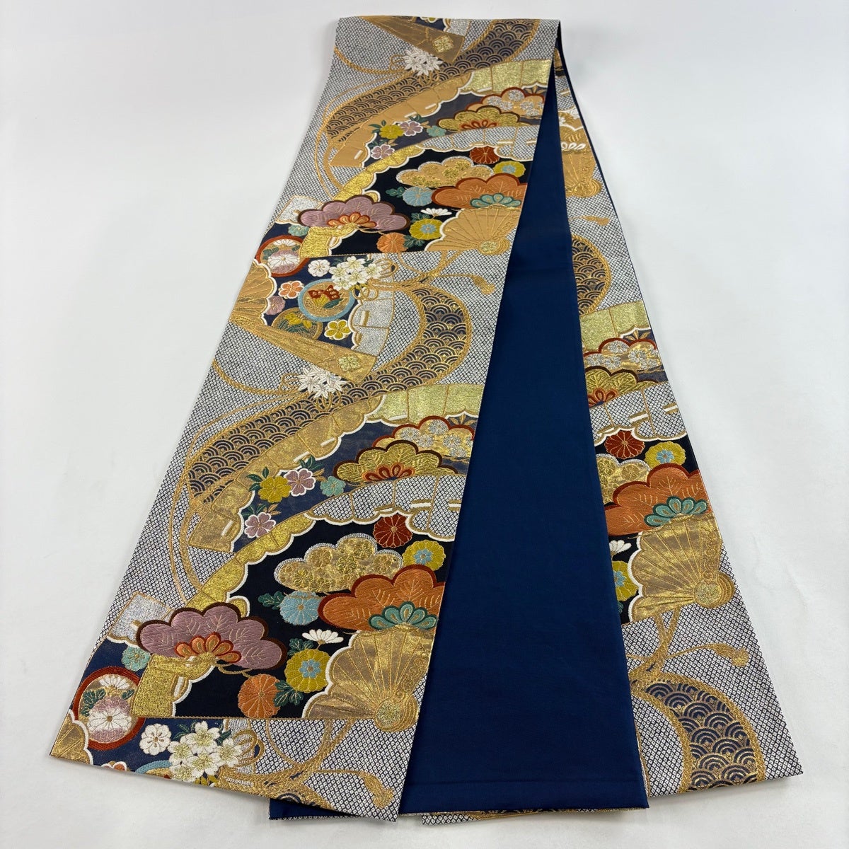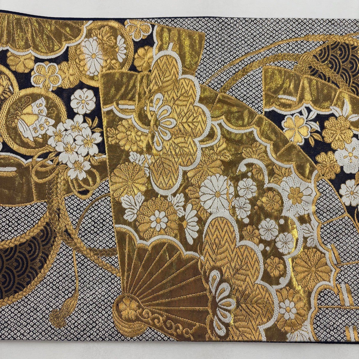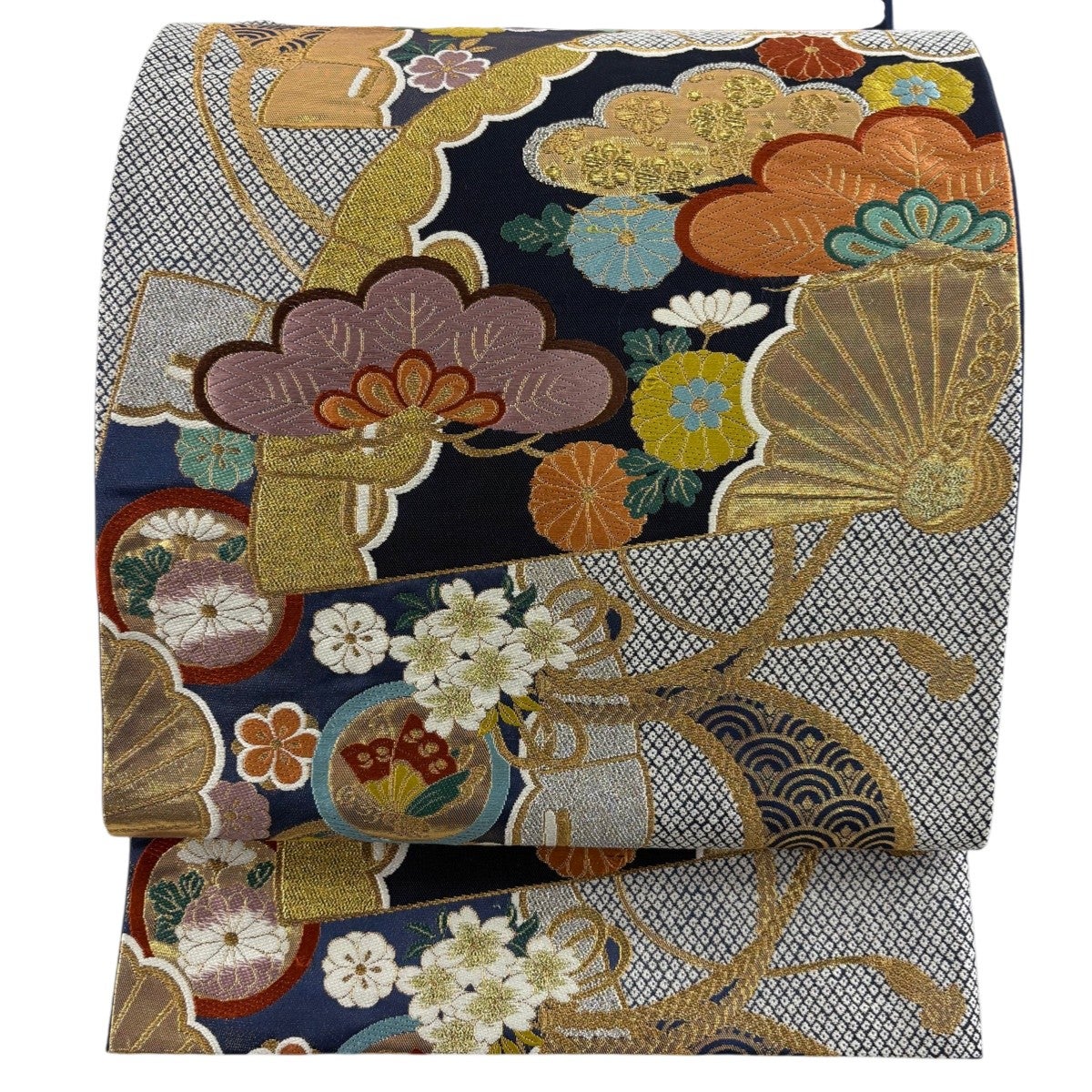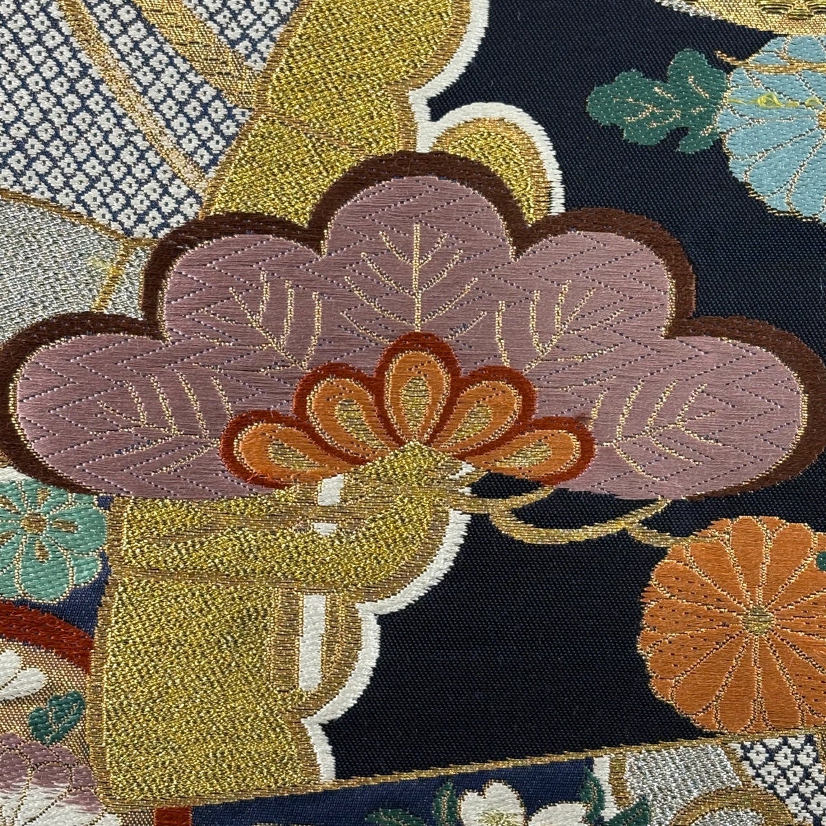 袋帯 秀品 扇面 花鳥 金糸 黒 お太鼓柄 正絹