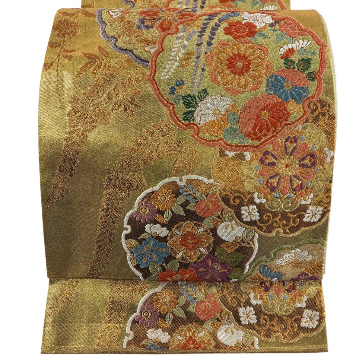 袋帯 秀品 牡丹 華文 金銀糸 箔 金色 六通 正絹