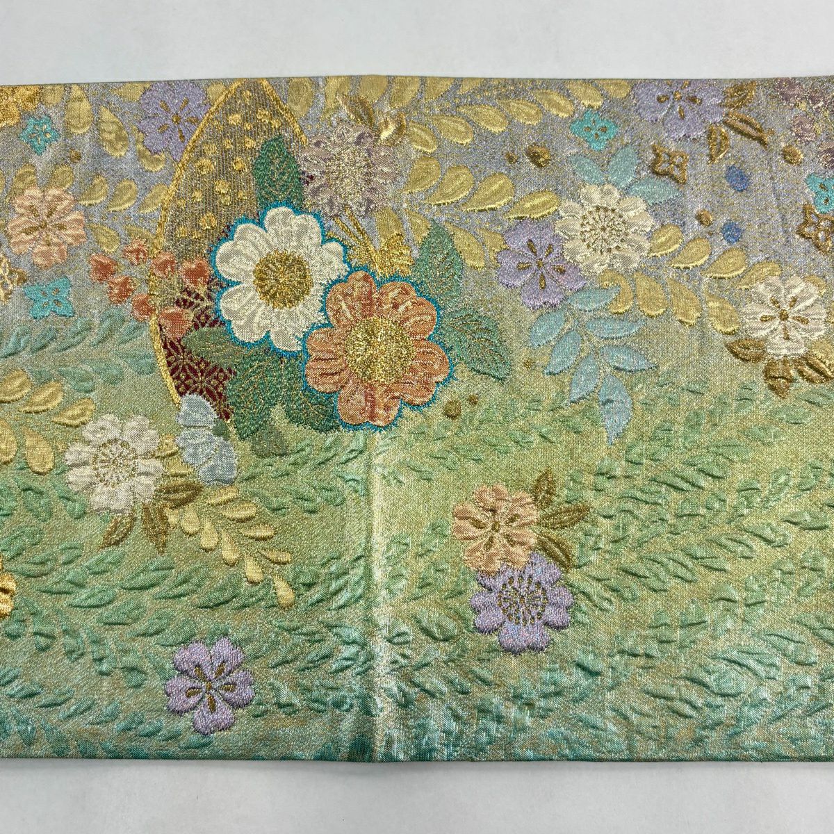 50%OFF 【美品】 袋帯 秀品 草花 武 金銀糸 箔 緑 六通 正絹 K50