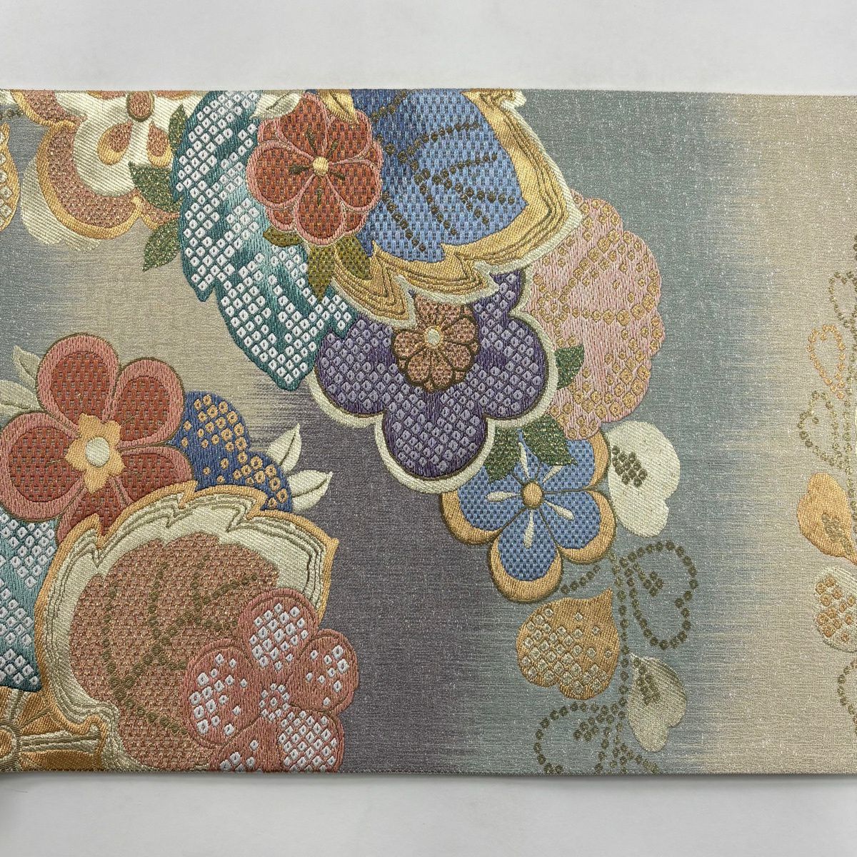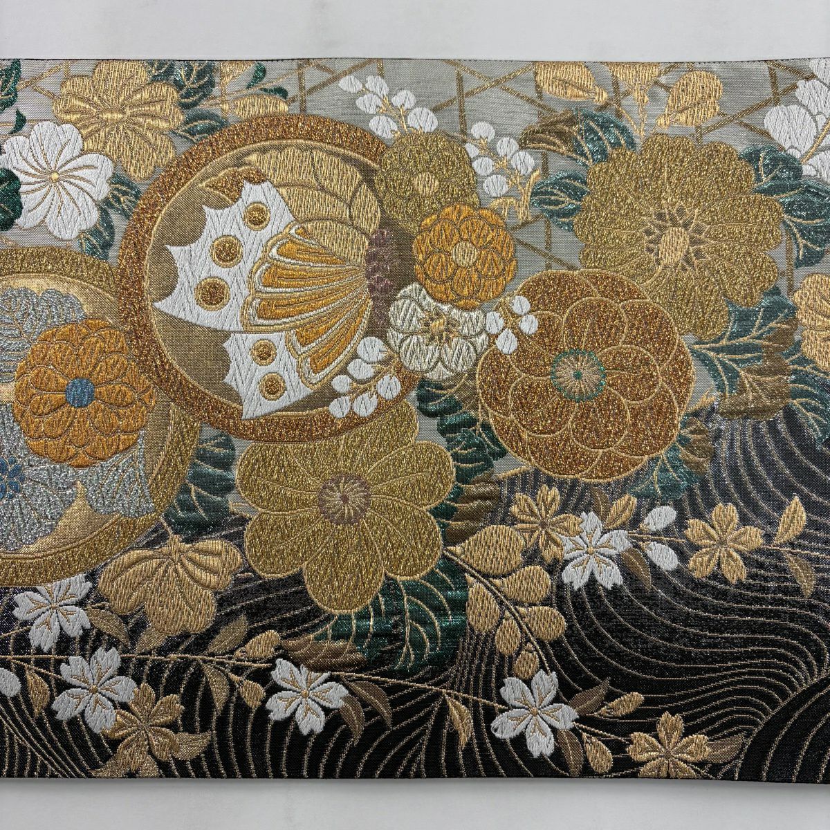 50%OFF 【美品】 袋帯 秀品 桜 波頭 金銀糸 唐織 青灰色 六通 正絹 K50