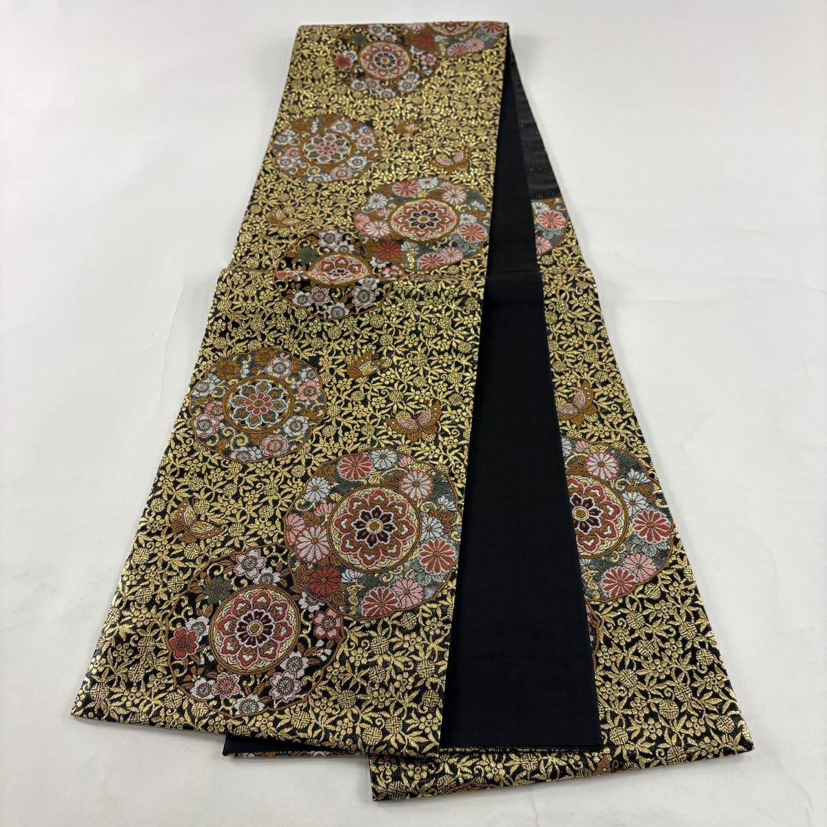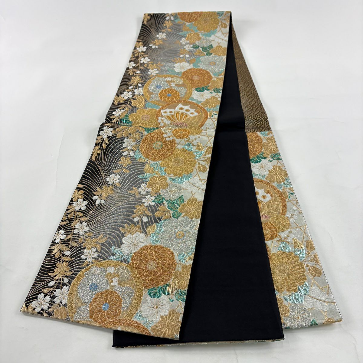 50%OFF 【美品】 袋帯 秀品 蜀江文 花菱 箔 墨色 全通 正絹 K50