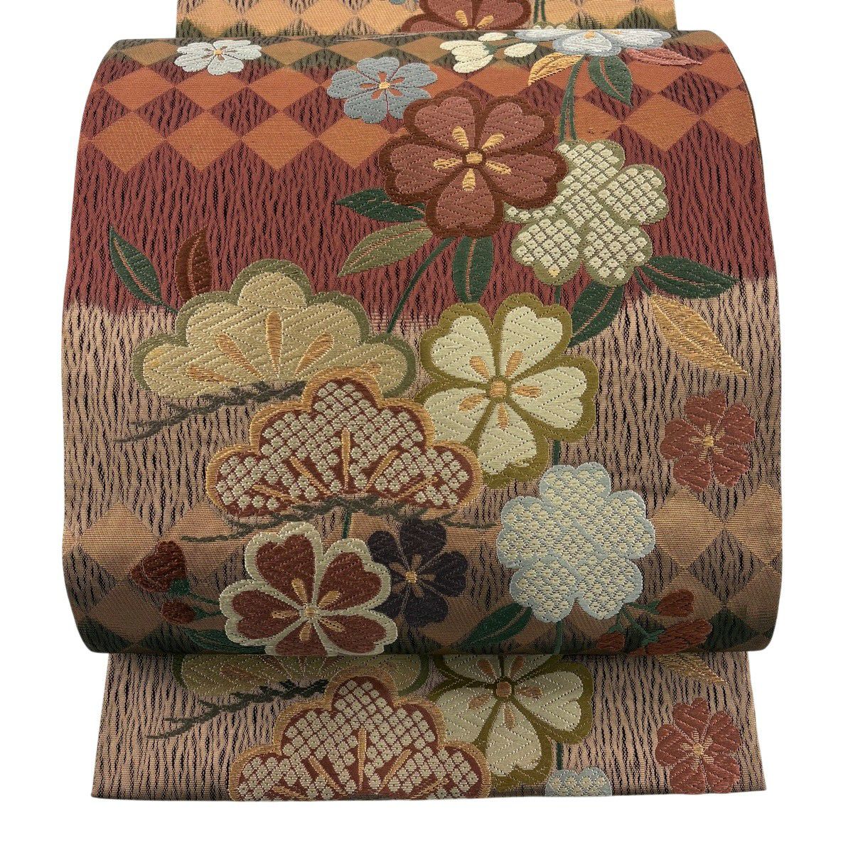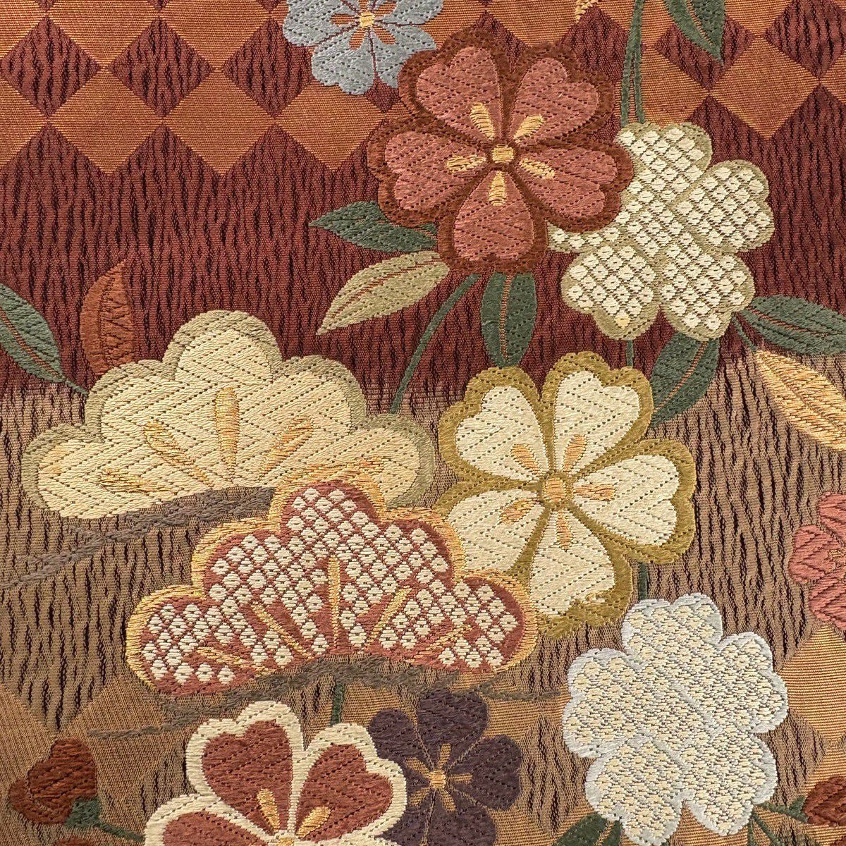 50%OFF 【美品】 袋帯 秀品 関西仕立て 扇 草花 箔 唐織 茶色 六通 正絹 K50
