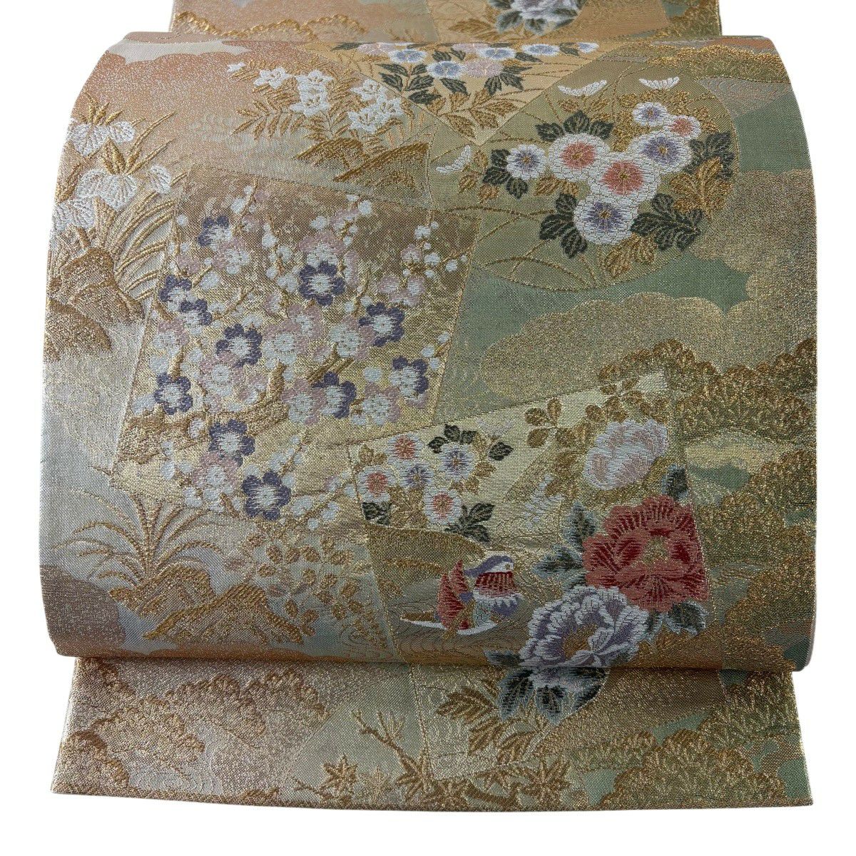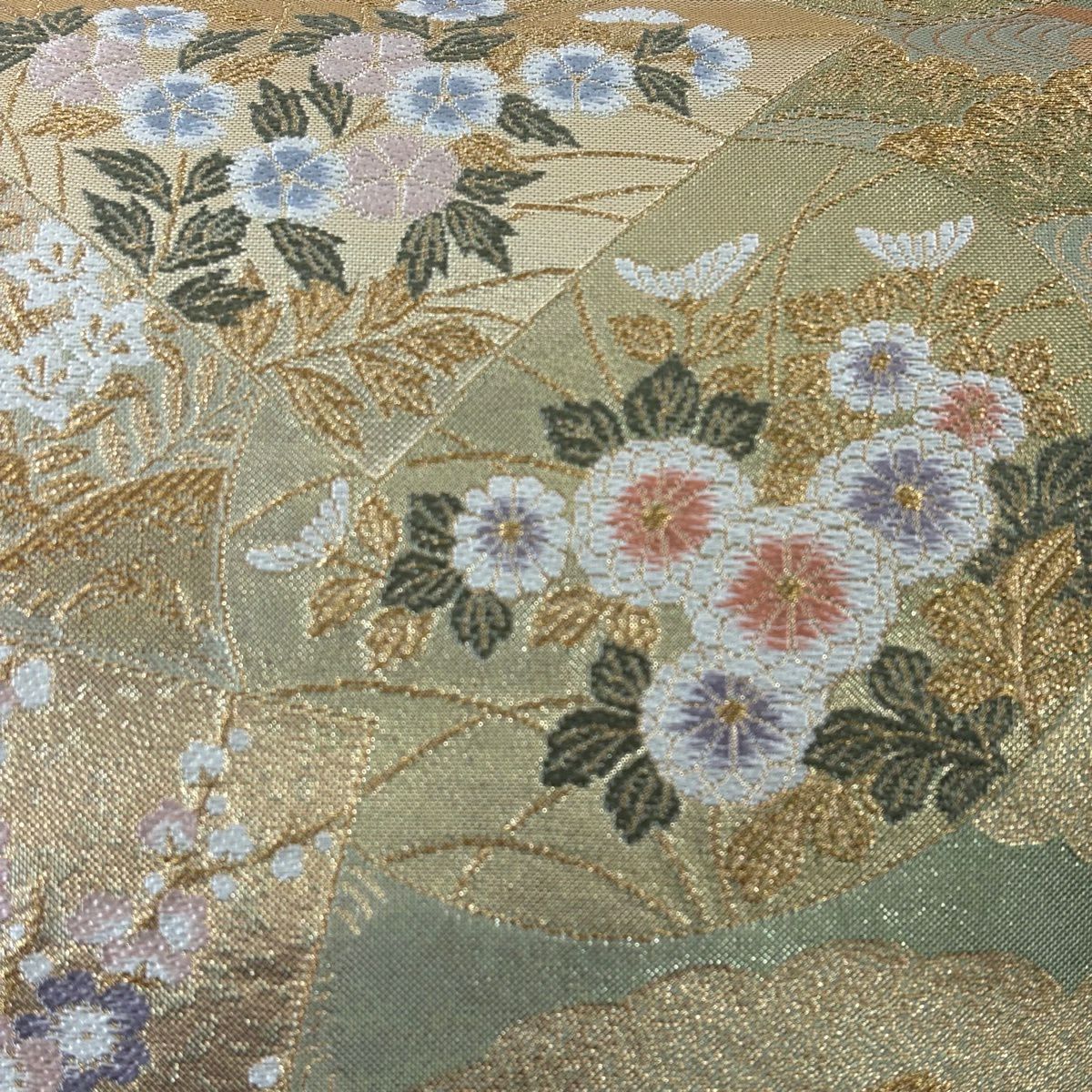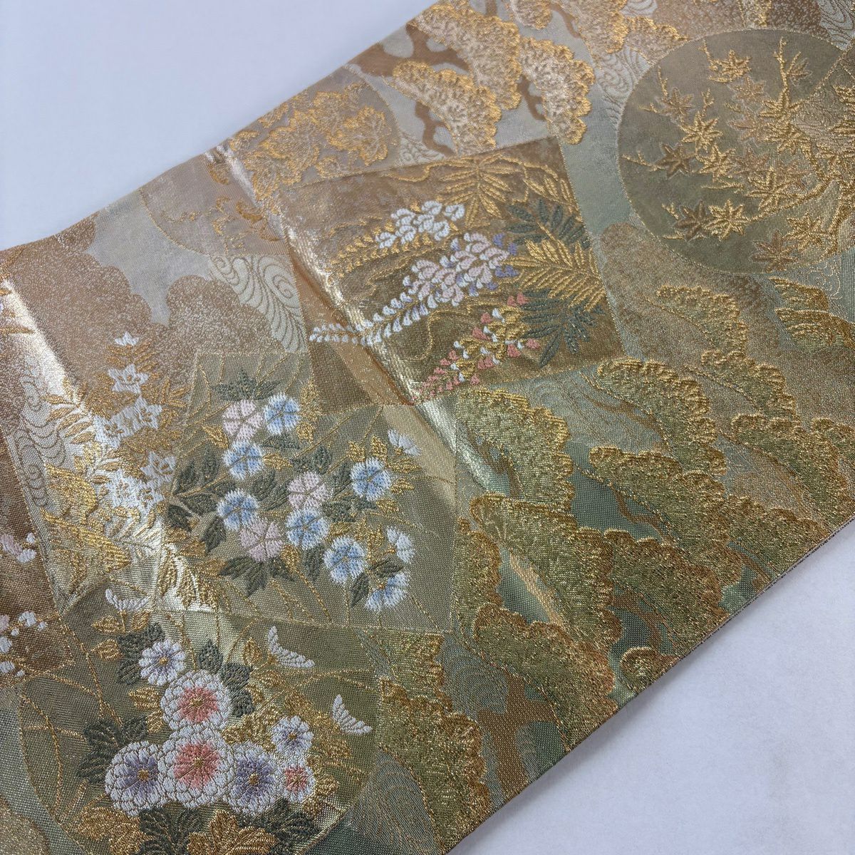 50%OFF 【美品】 袋帯 秀品 菊 幾何学模様 唐織 箔 灰緑 六通 正絹 K50