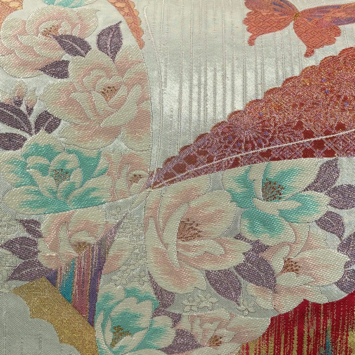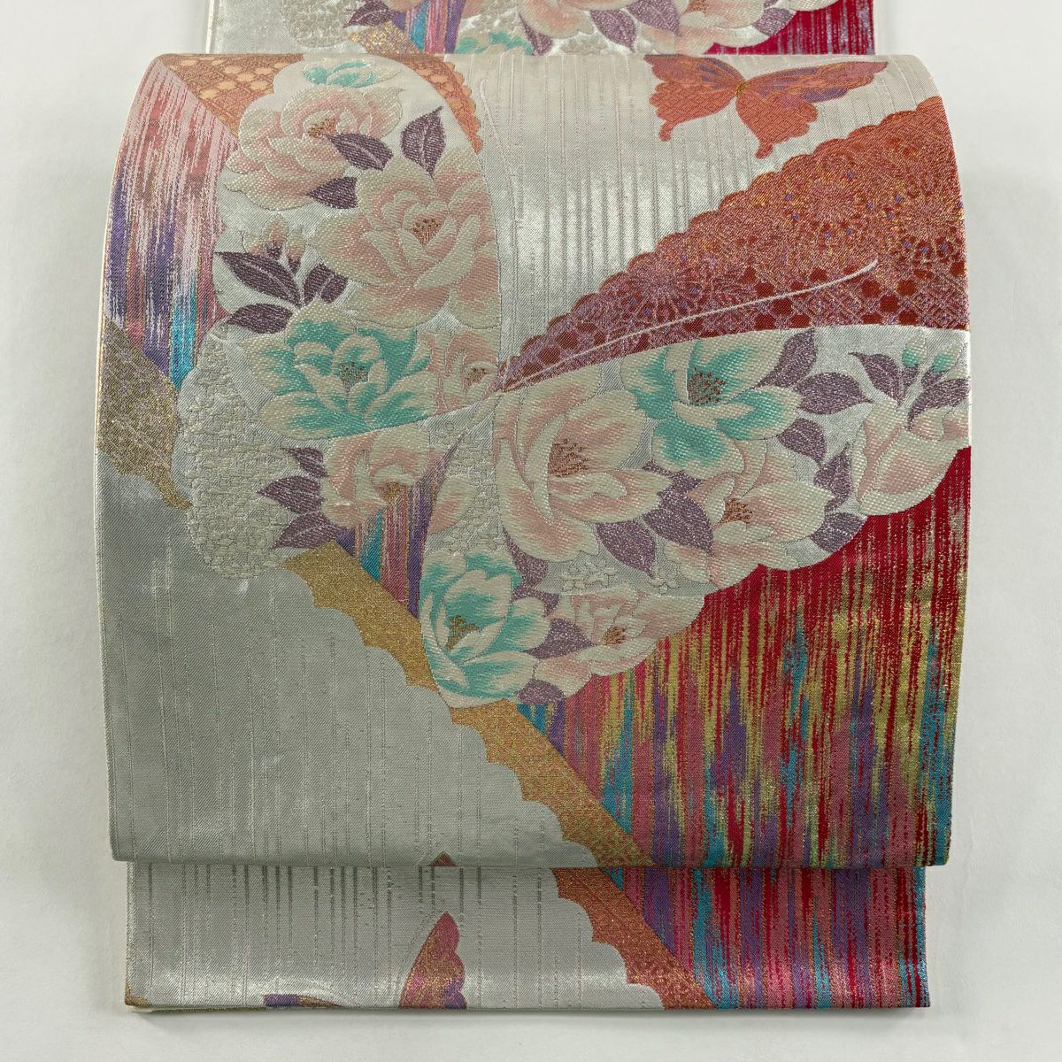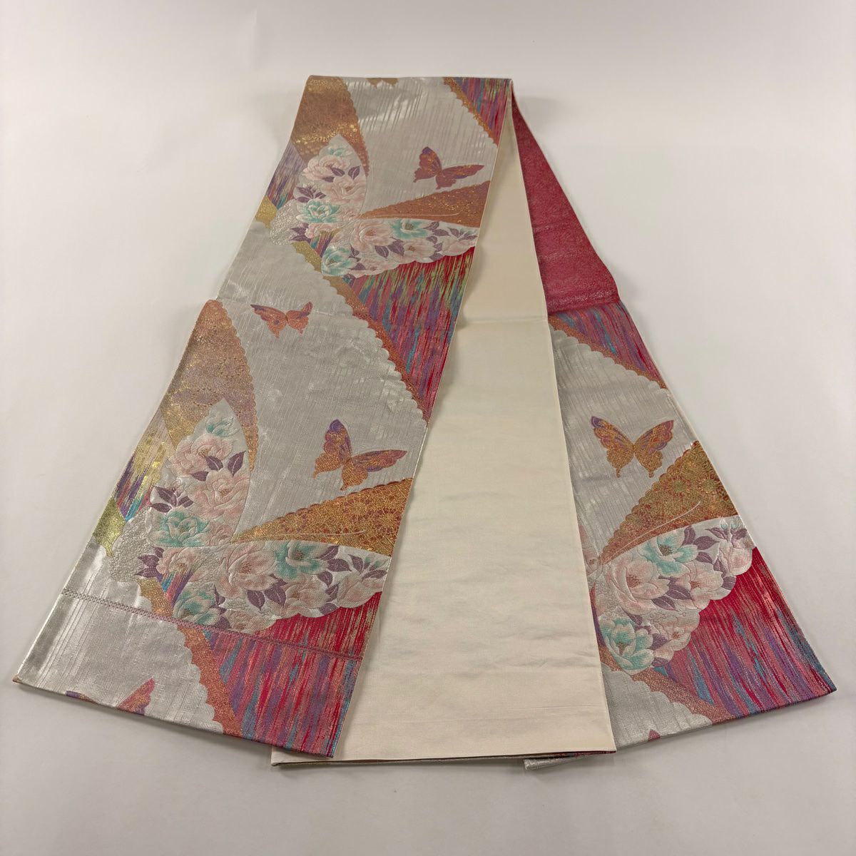 【美品】 袋帯 秀品 草花 蝶 刺繍 箔 銀色 六通 正絹