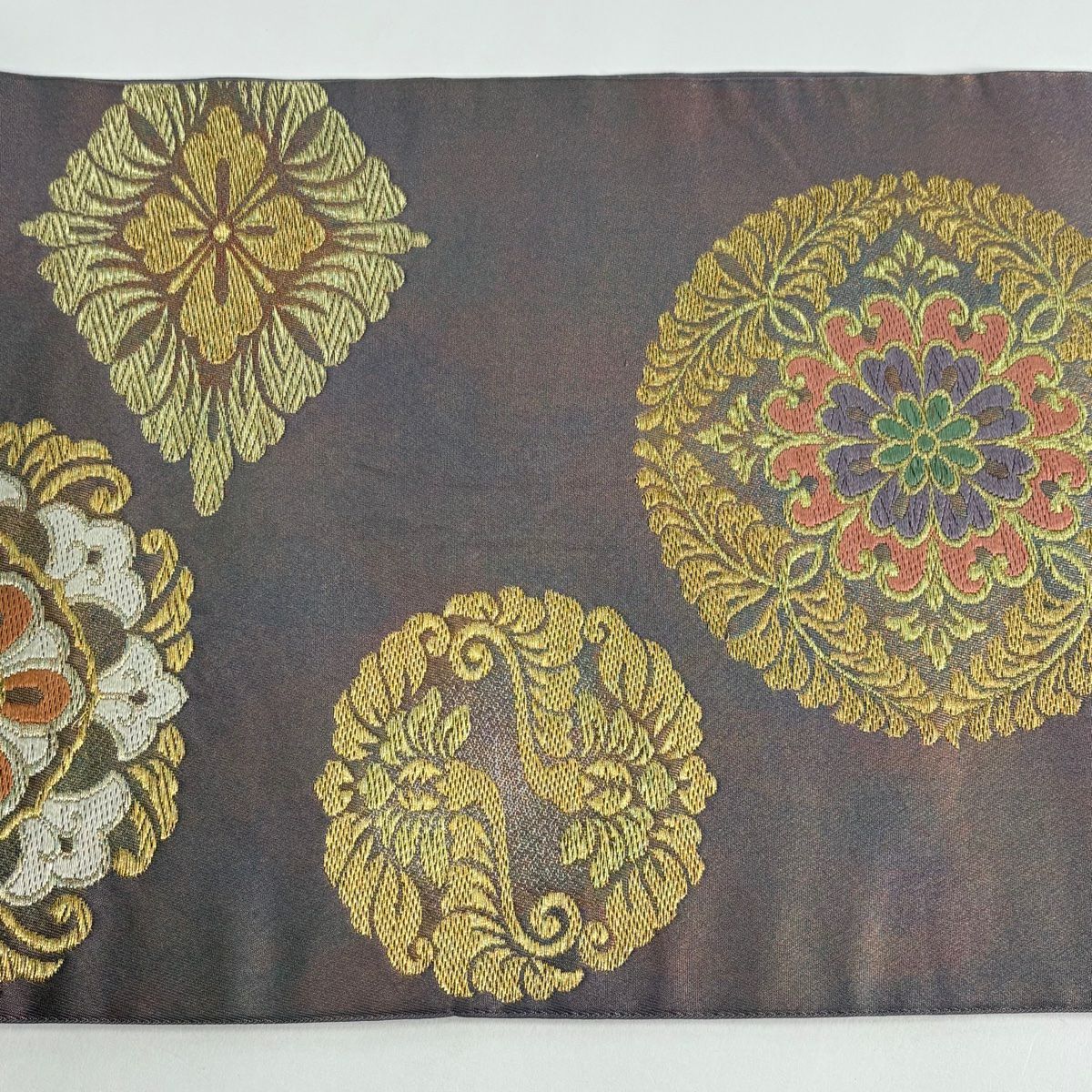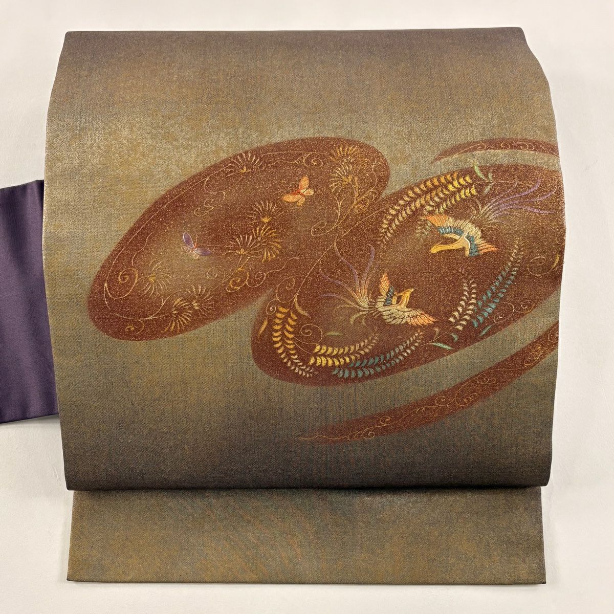 名古屋帯 秀品 尾長鳥 花唐草 金彩 箔 紫 正絹