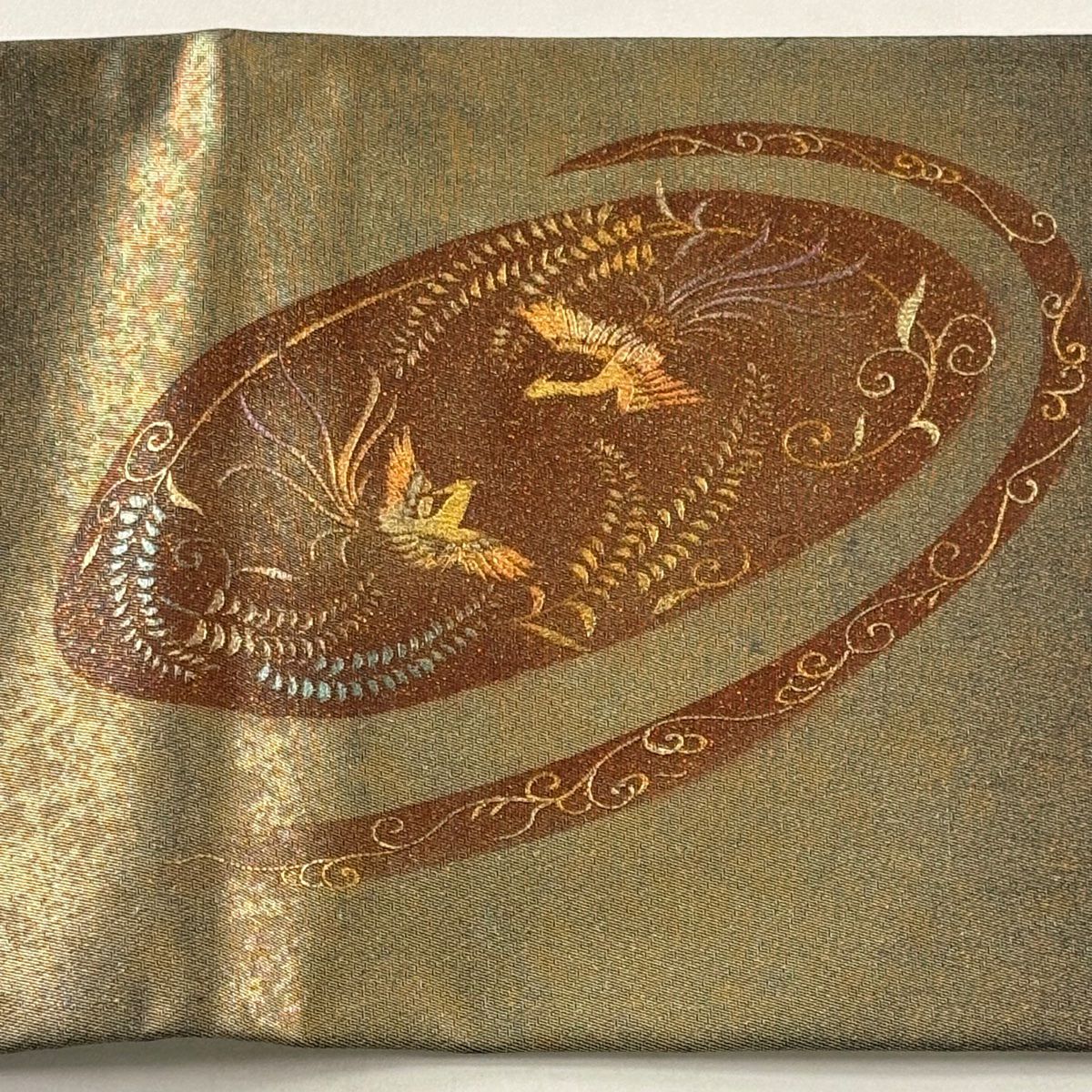 【美品】 袋帯 秀品 幾何学 金糸 箔 茶緑色 六通 正絹