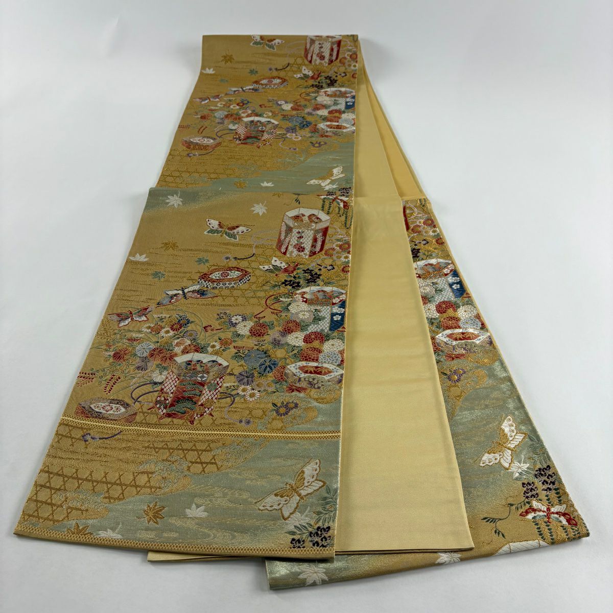 【美品】 袋帯 秀品 関西仕立て 貝桶 蝶 金糸 箔 金色 六通 正絹