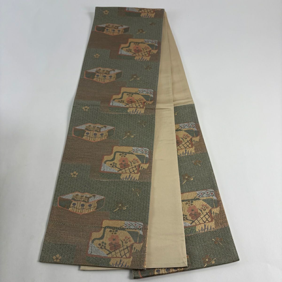 【美品】 袋帯 秀品 枝梅 菱 箔 灰緑 六通 正絹