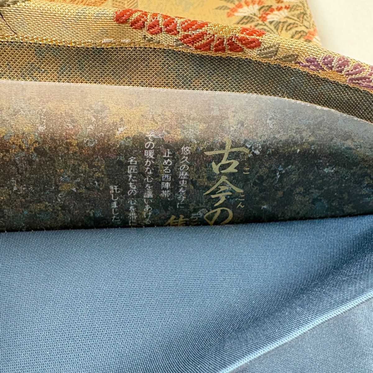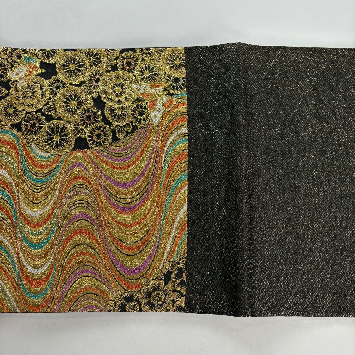 【美品】 袋帯 秀品 雲霞彩花小袖絵文 金色 六通 正絹