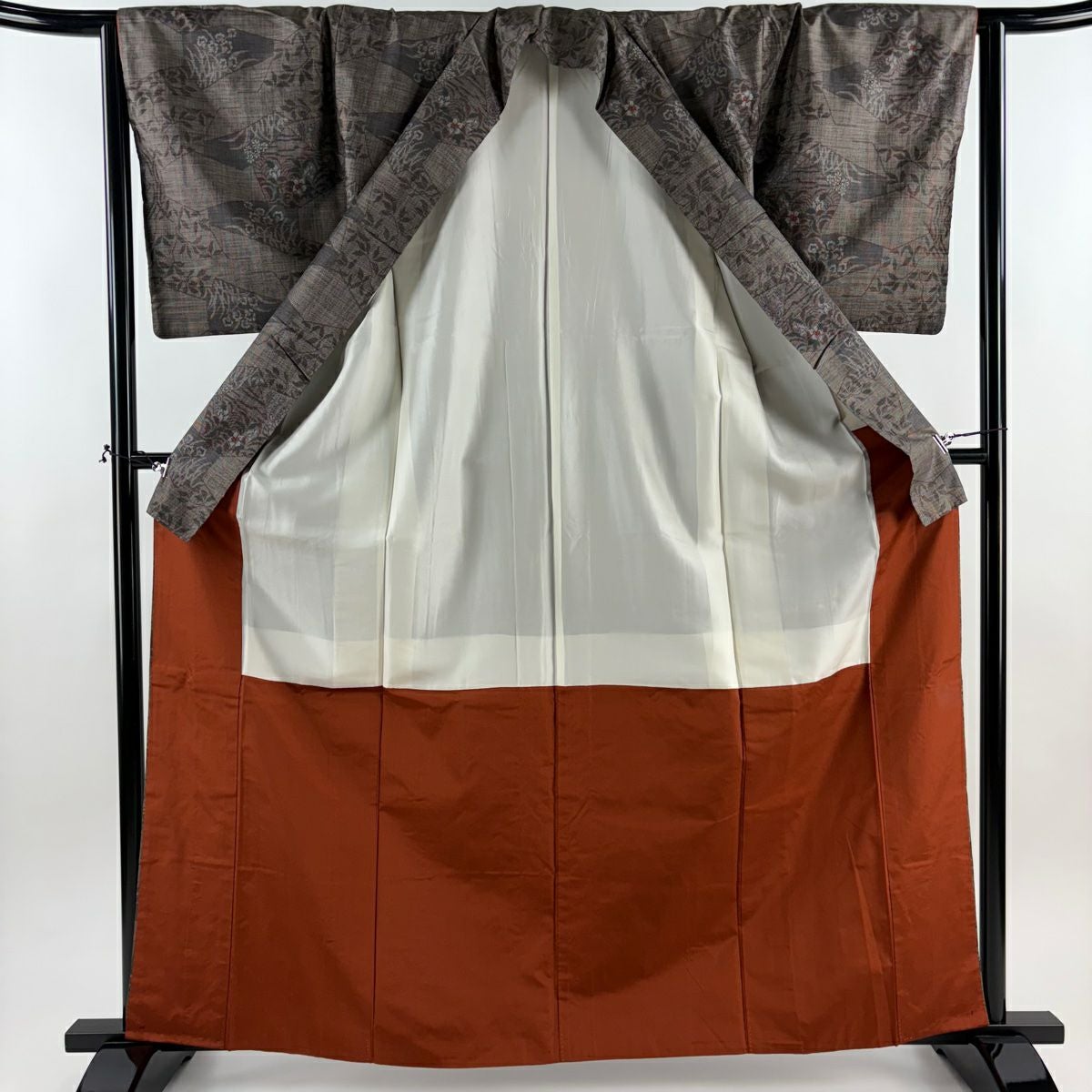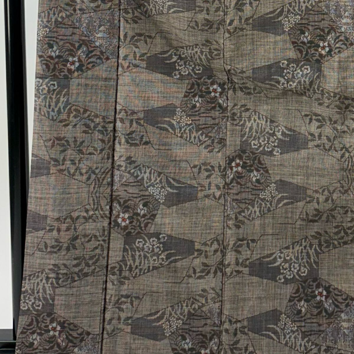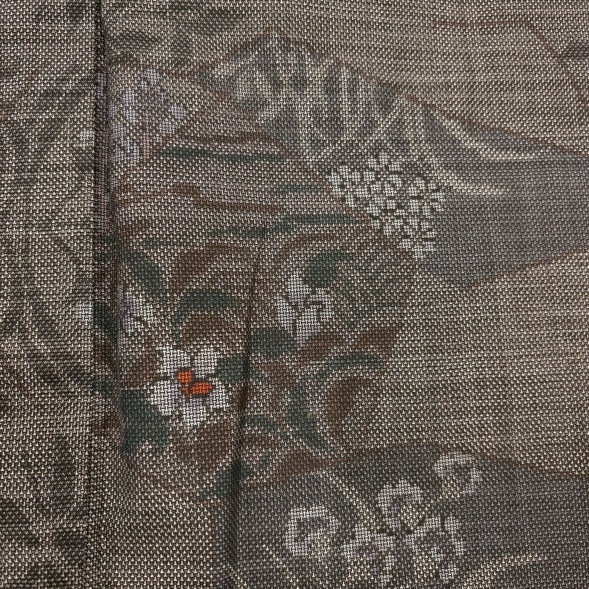 【美品】 紬 身丈163.5cm 裄丈64cm M 袷 草花 幾何学模様 焦茶色 正絹 秀品