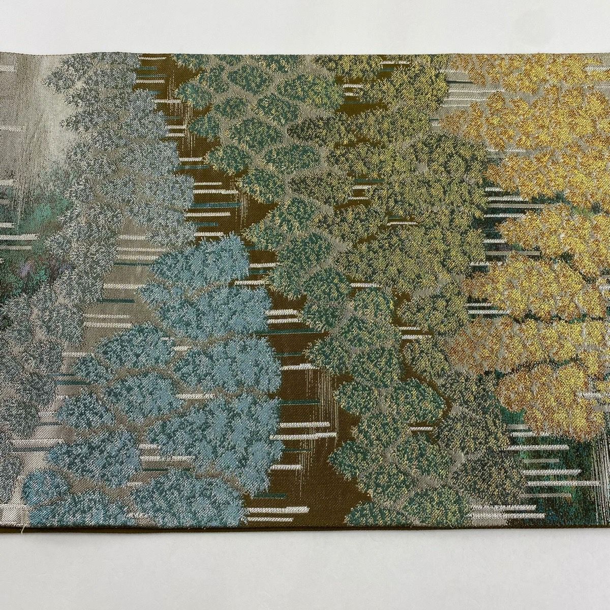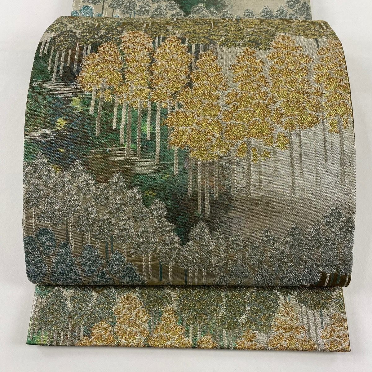 【美品】 袋帯 秀品 樹木 柴垣 灰緑 全通 正絹