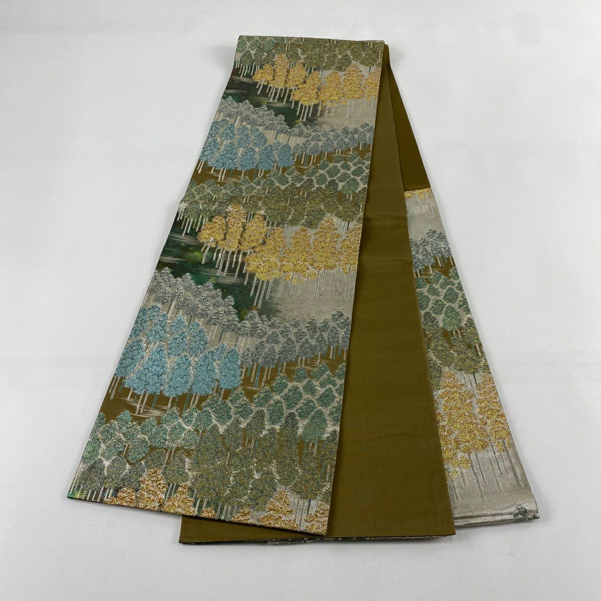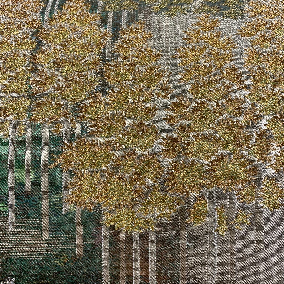 【美品】 袋帯 秀品 樹木 風景 箔 茶緑色 六通 正絹