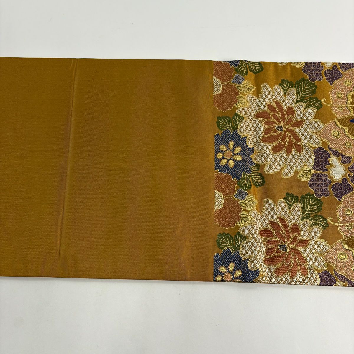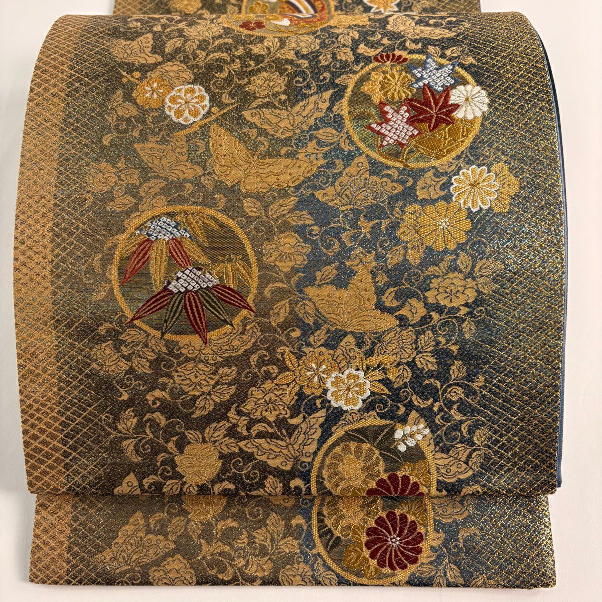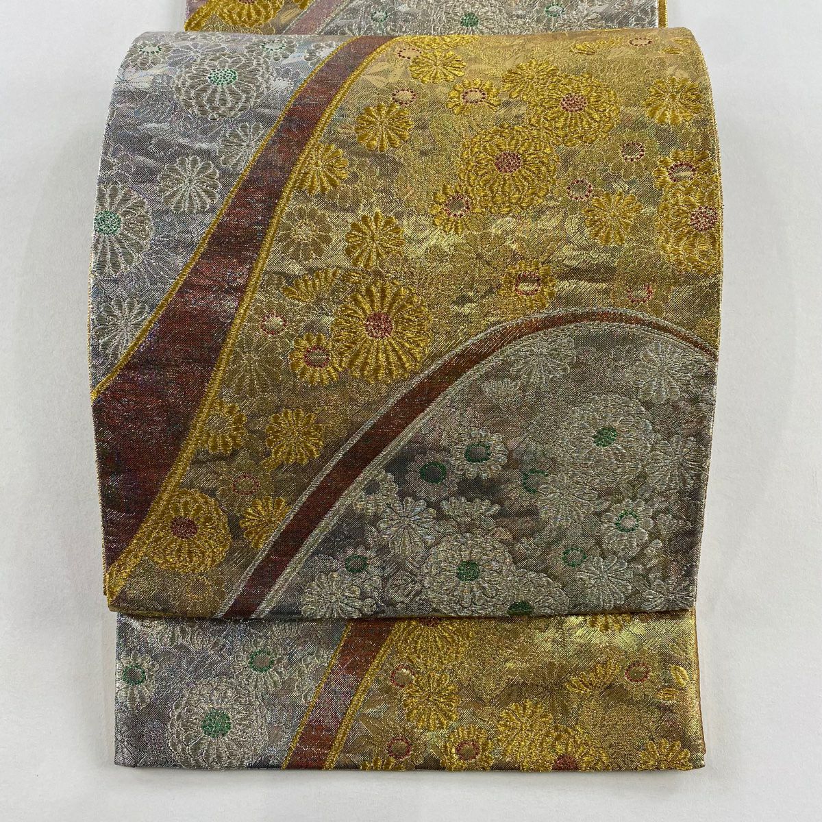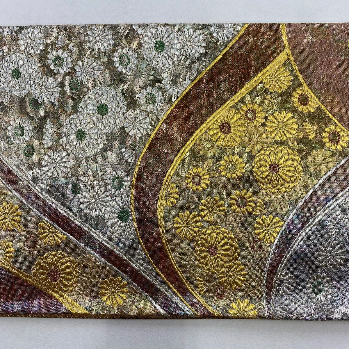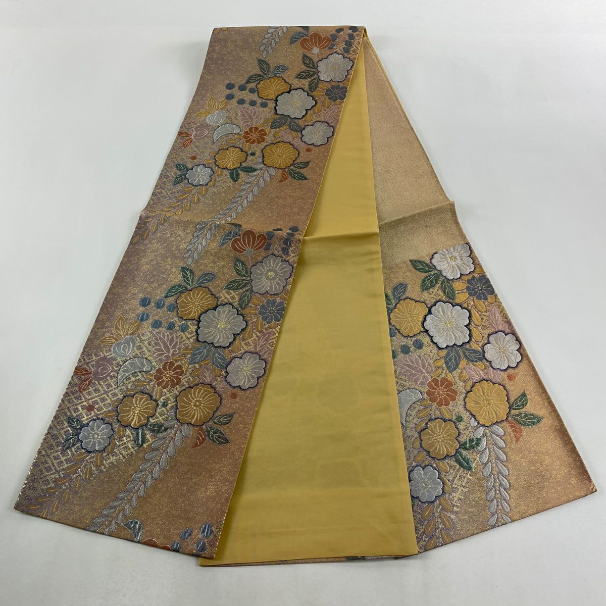 【美品】 袋帯 秀品 菊 草花 金銀糸 箔 金色 六通 正絹