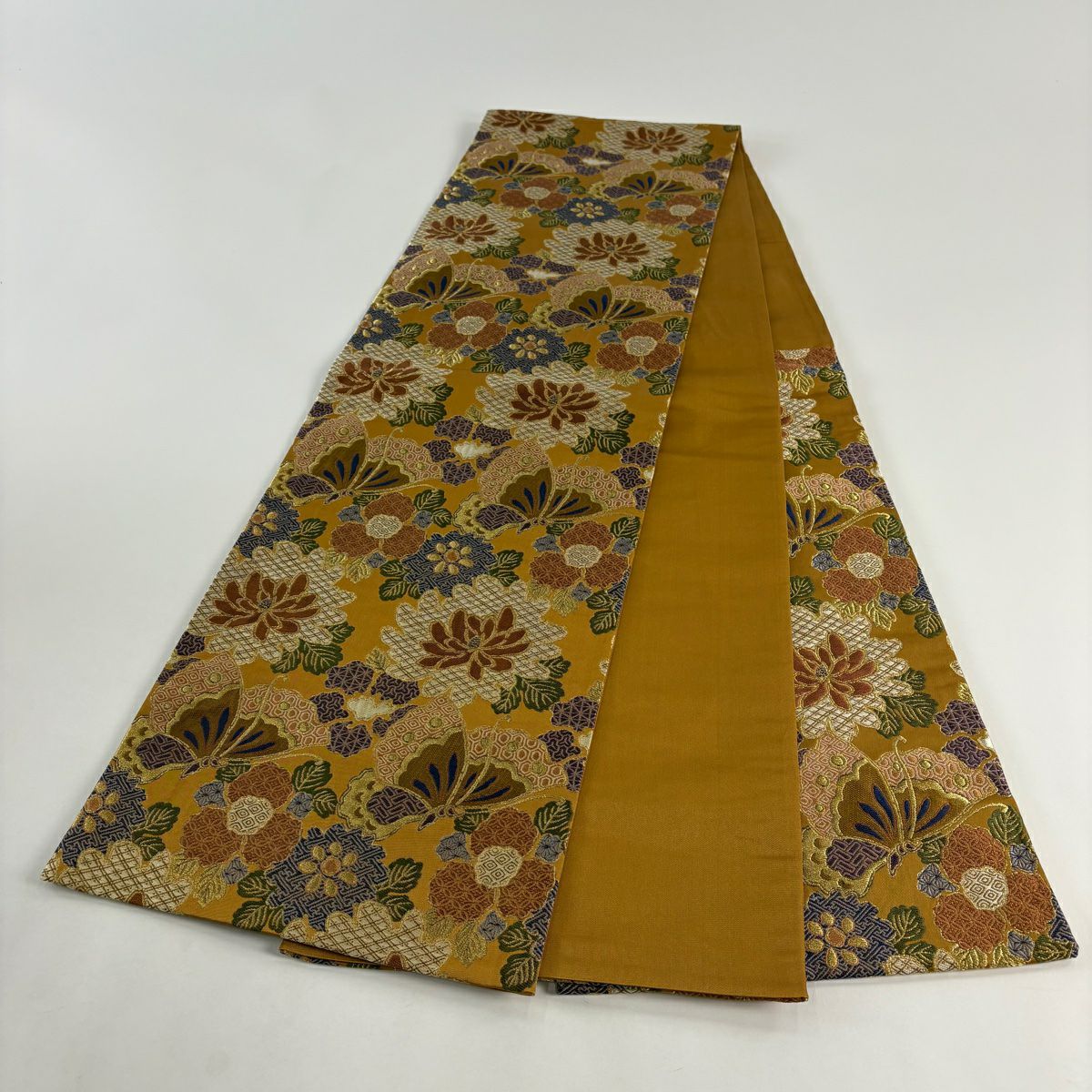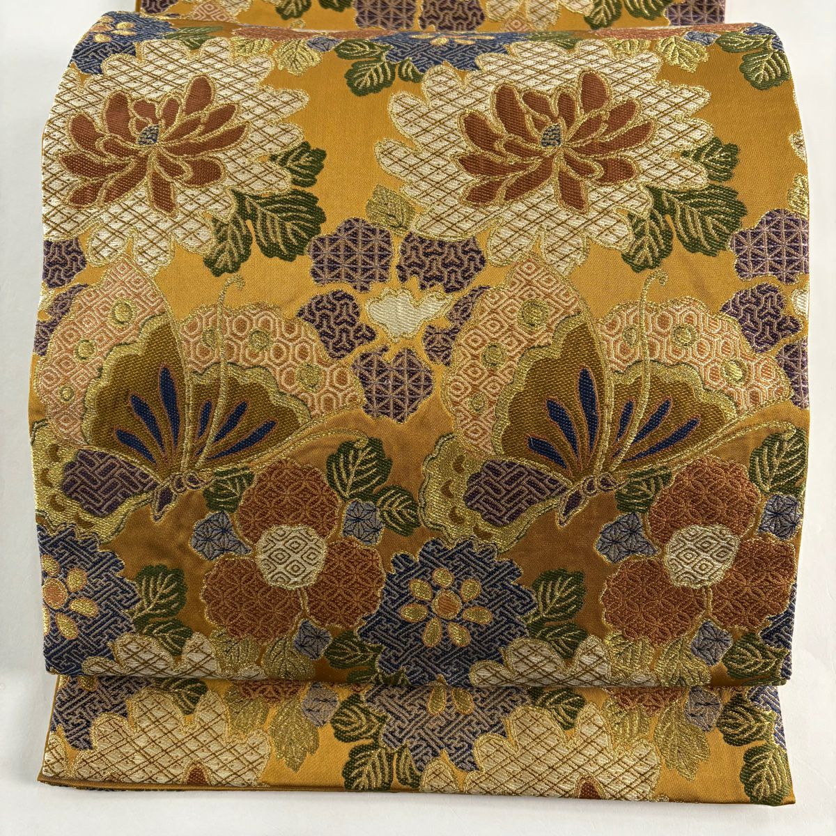 【美品】 袋帯 秀品 草花 蝶 金糸 山吹茶色 六通 正絹