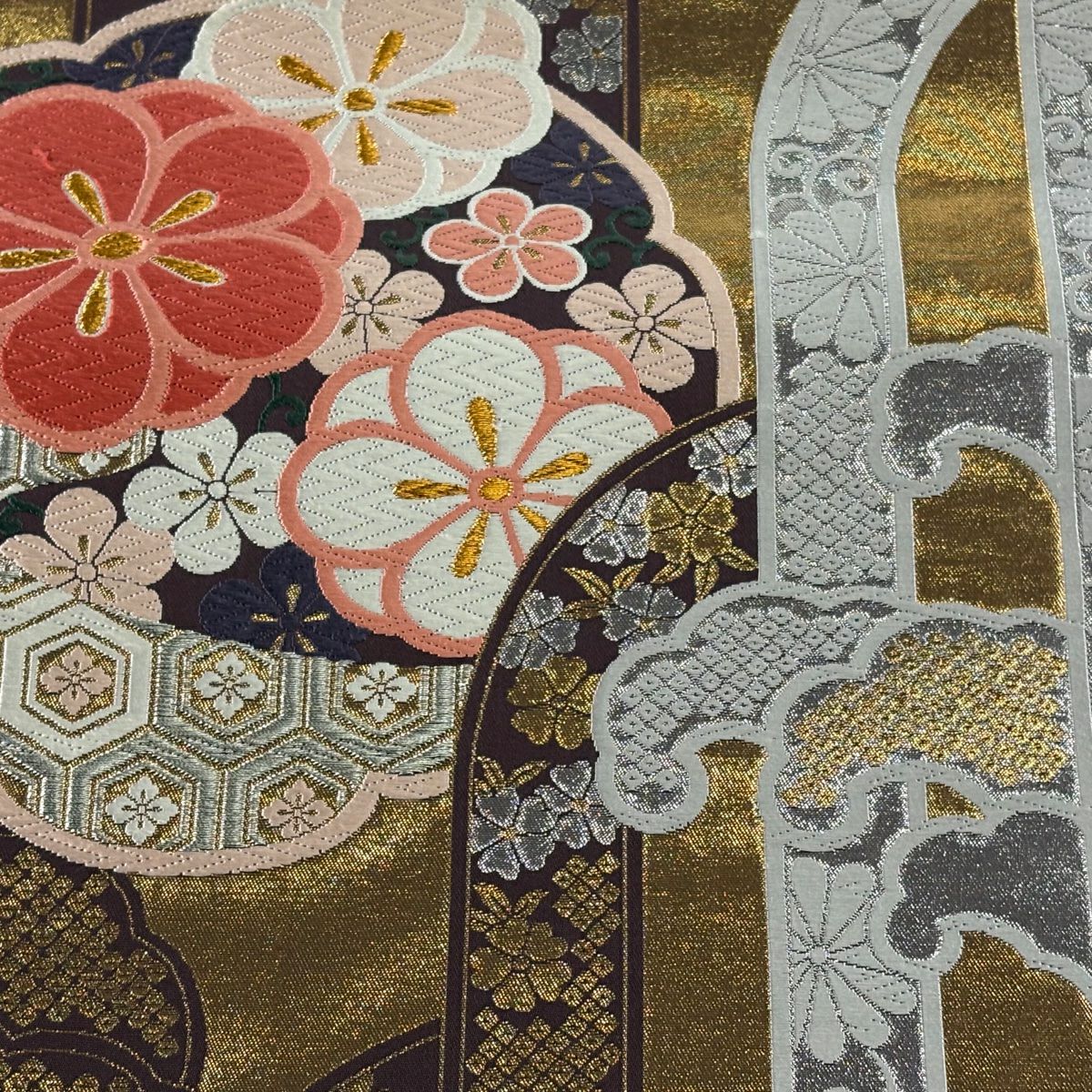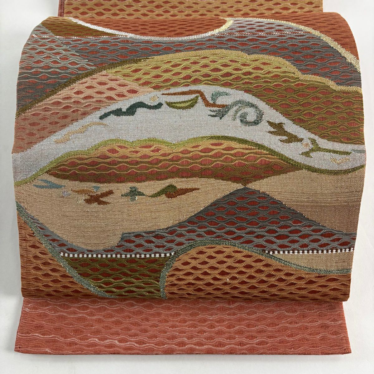 【美品】 袋帯 秀品 幾何学模様 金通し 銀通し 茜色 お太鼓柄 正絹