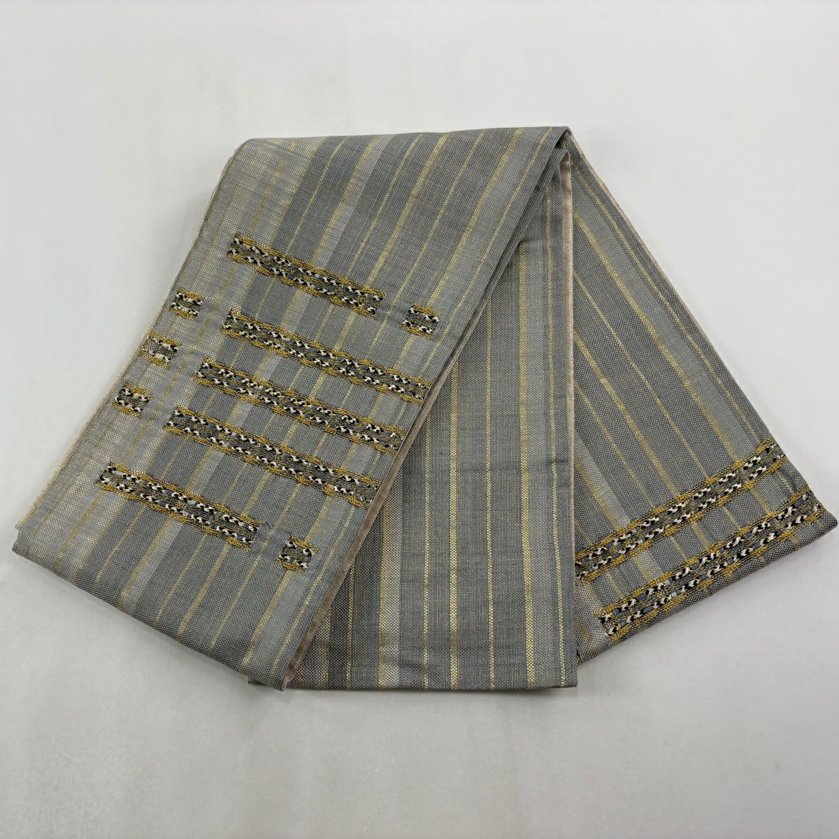 【美品】 袋帯 秀品 縞 幾何学模様 金糸 金色 お太鼓柄 正絹