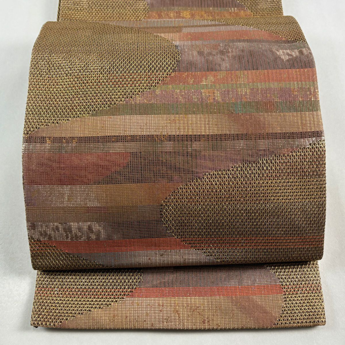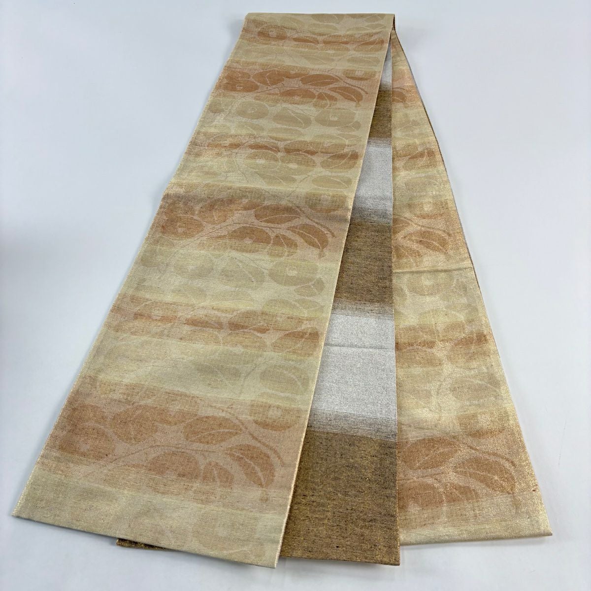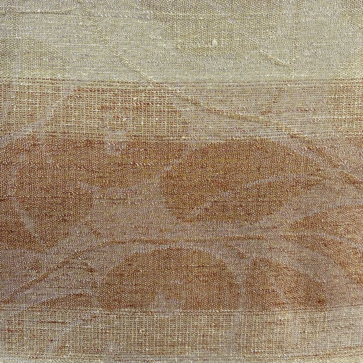 【美品】 袋帯 秀品 草花 幾何学模様 金通し 裂嵌め 薄茶色 お太鼓柄 正絹