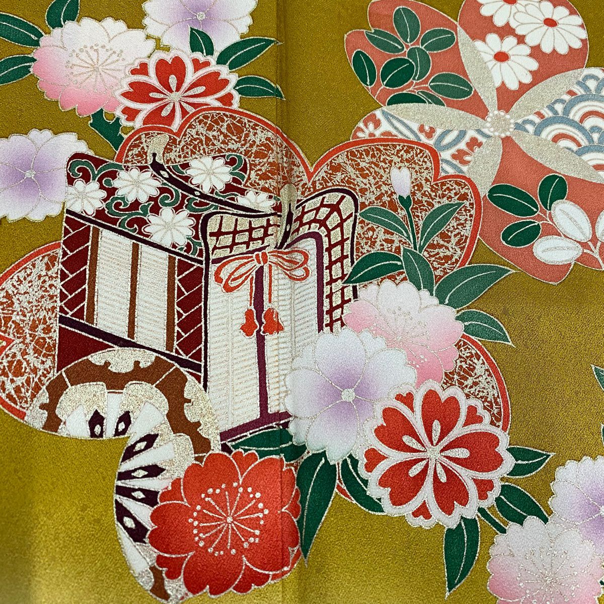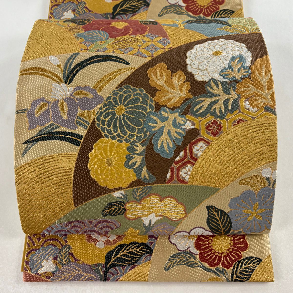 【美品】 袋帯 秀品 関西仕立て 菊 箔 黄土色 全通 正絹