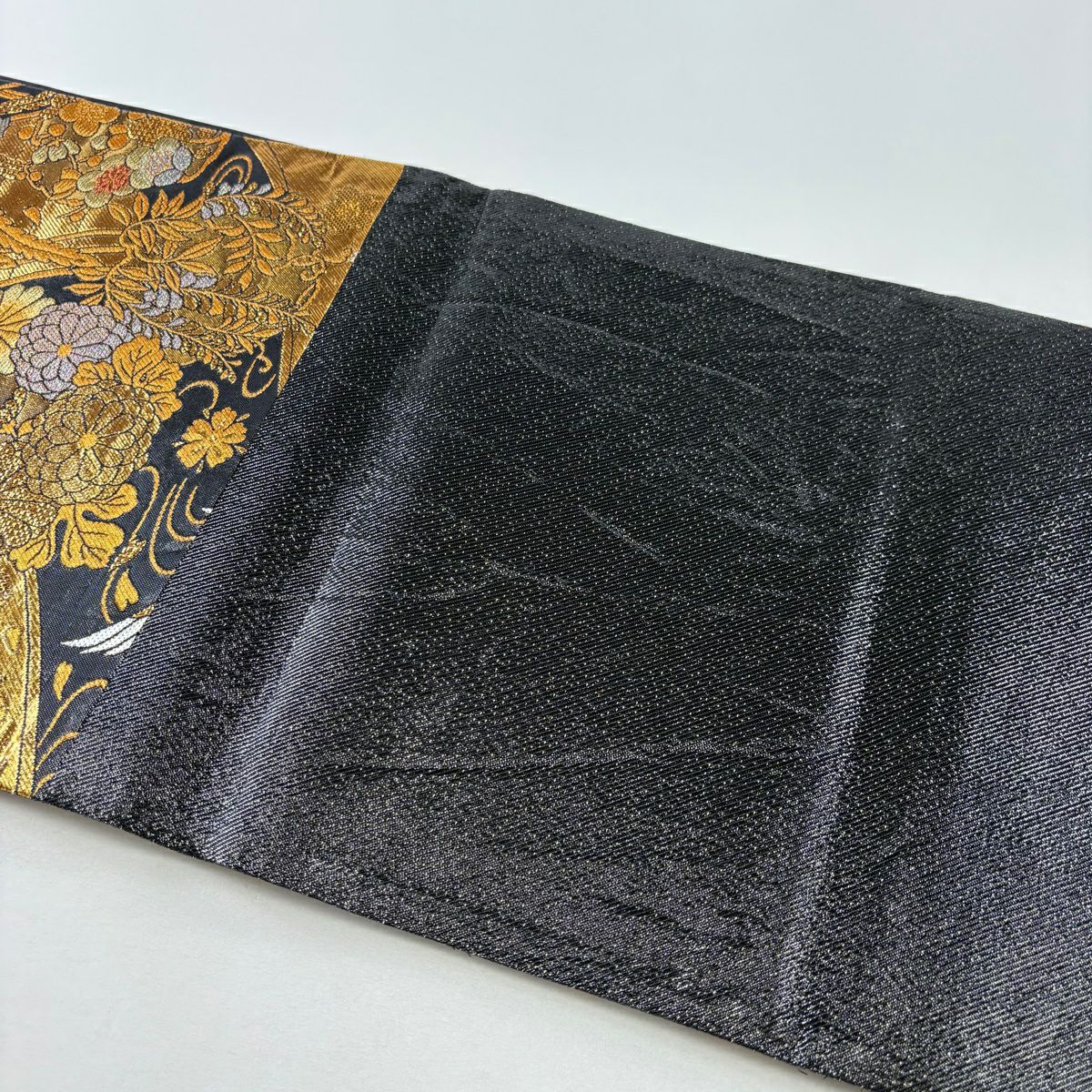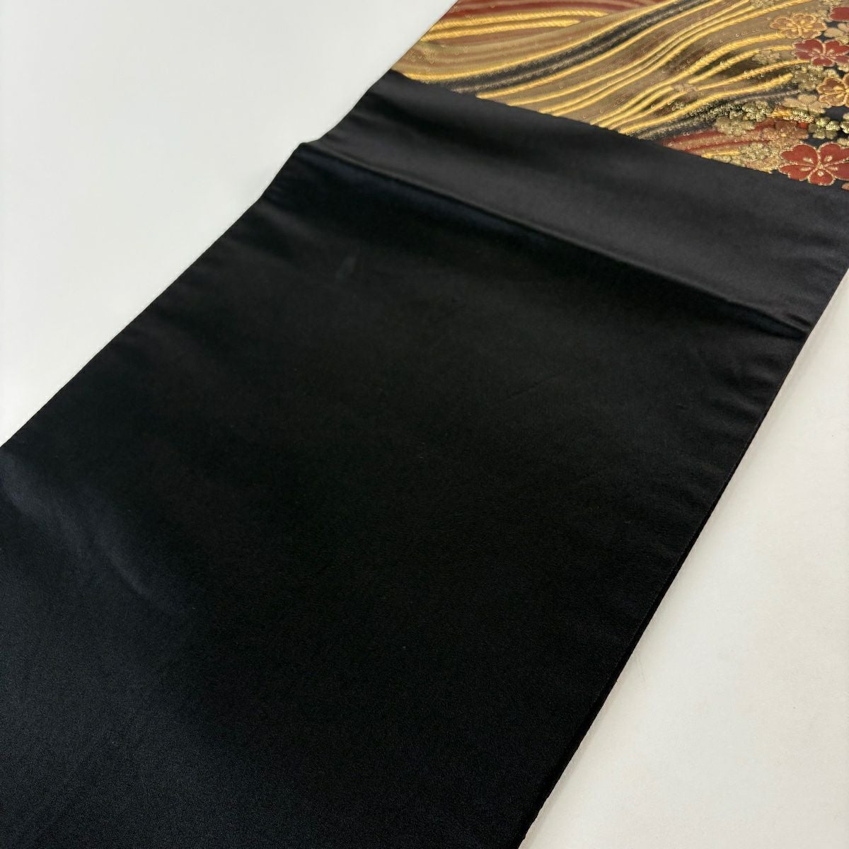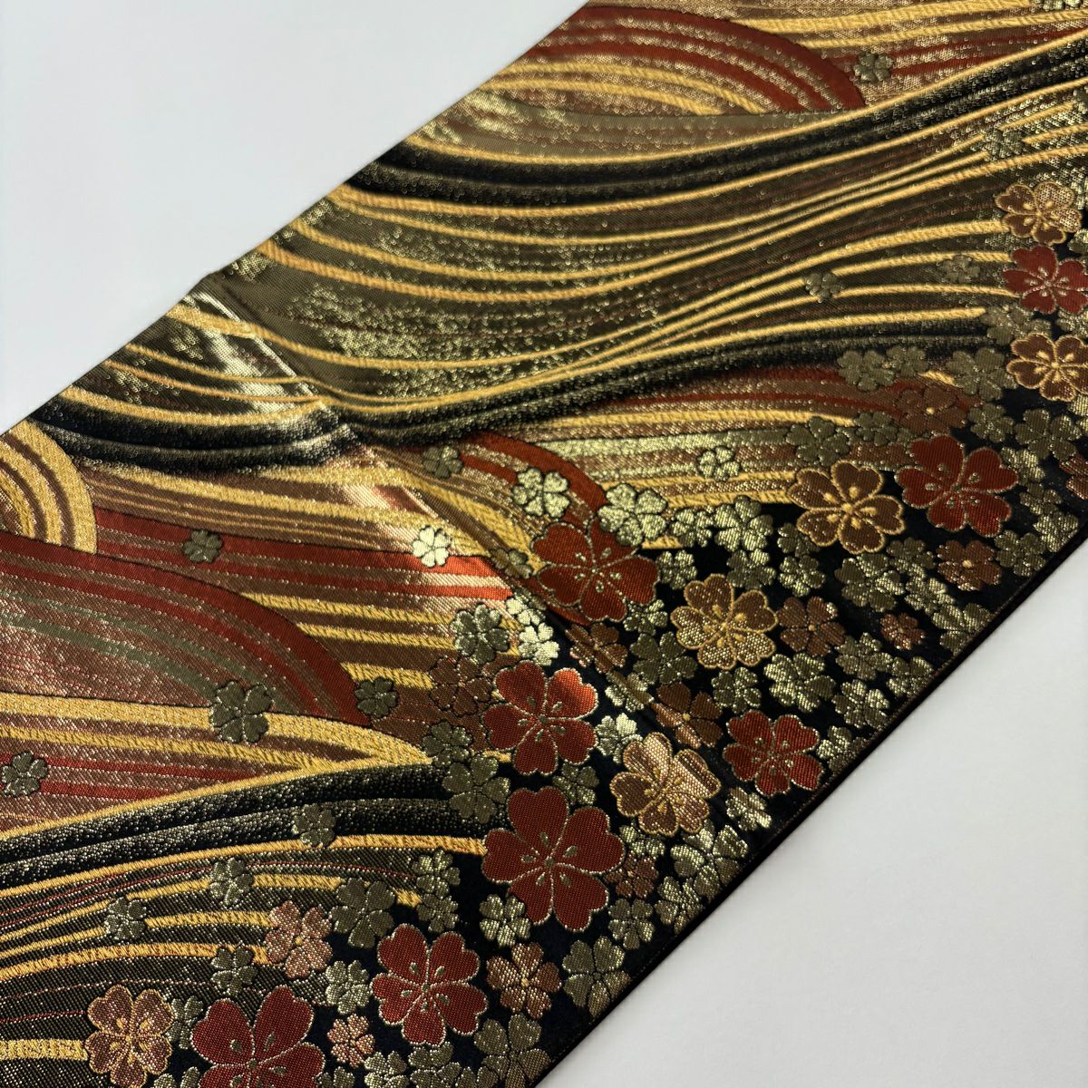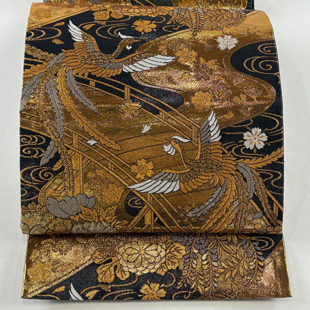 【美品】 袋帯 秀品 桜 波 箔 唐織 黒 六通 正絹