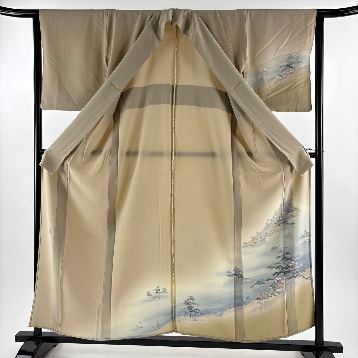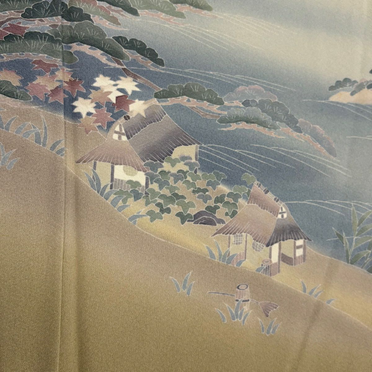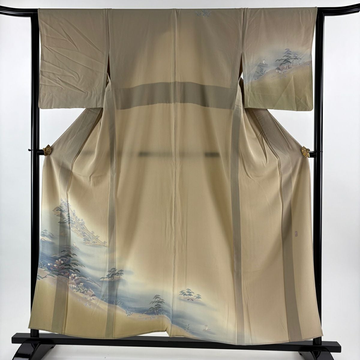 付下げ 身丈154.5cm 裄丈64cm M 単衣 落款あり 風景 家屋 ぼかし 薄茶色 正絹 秀品