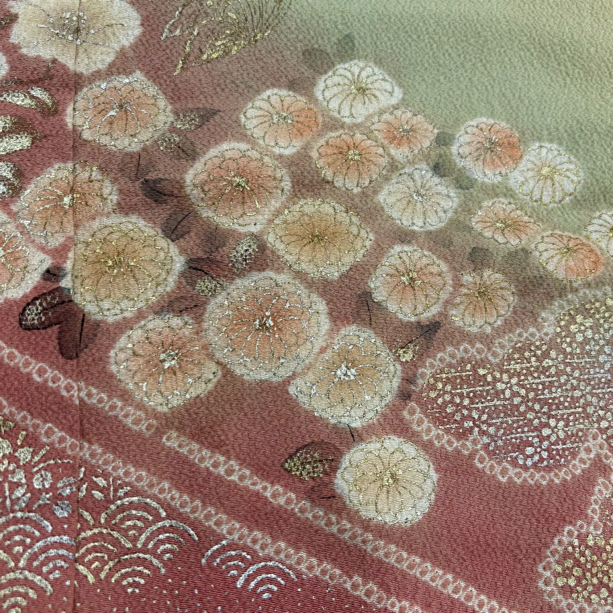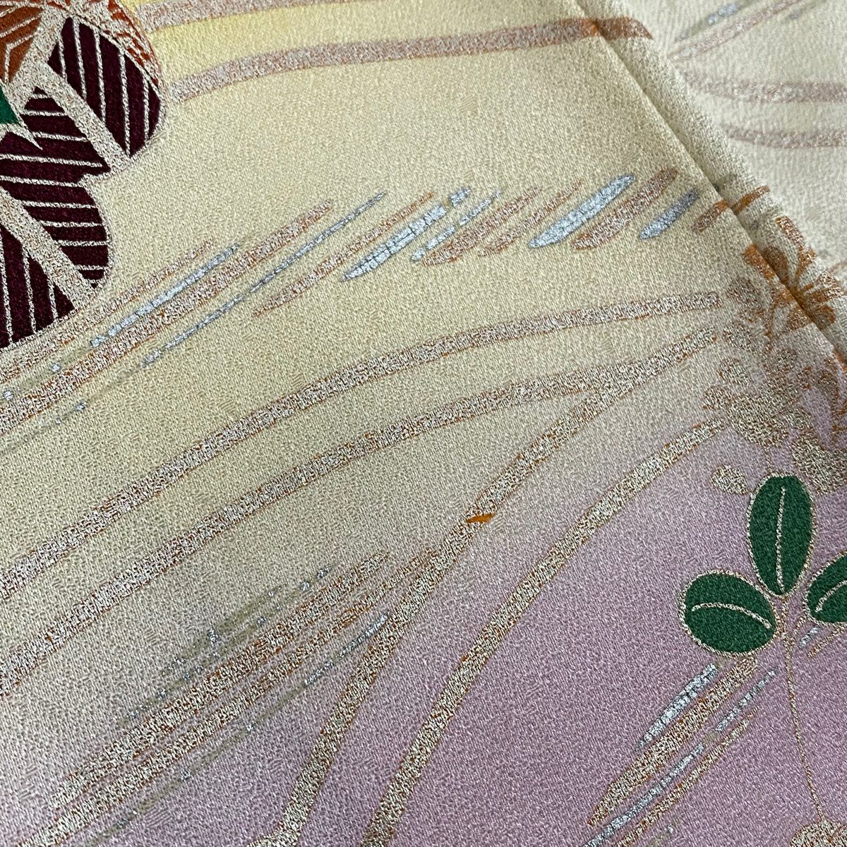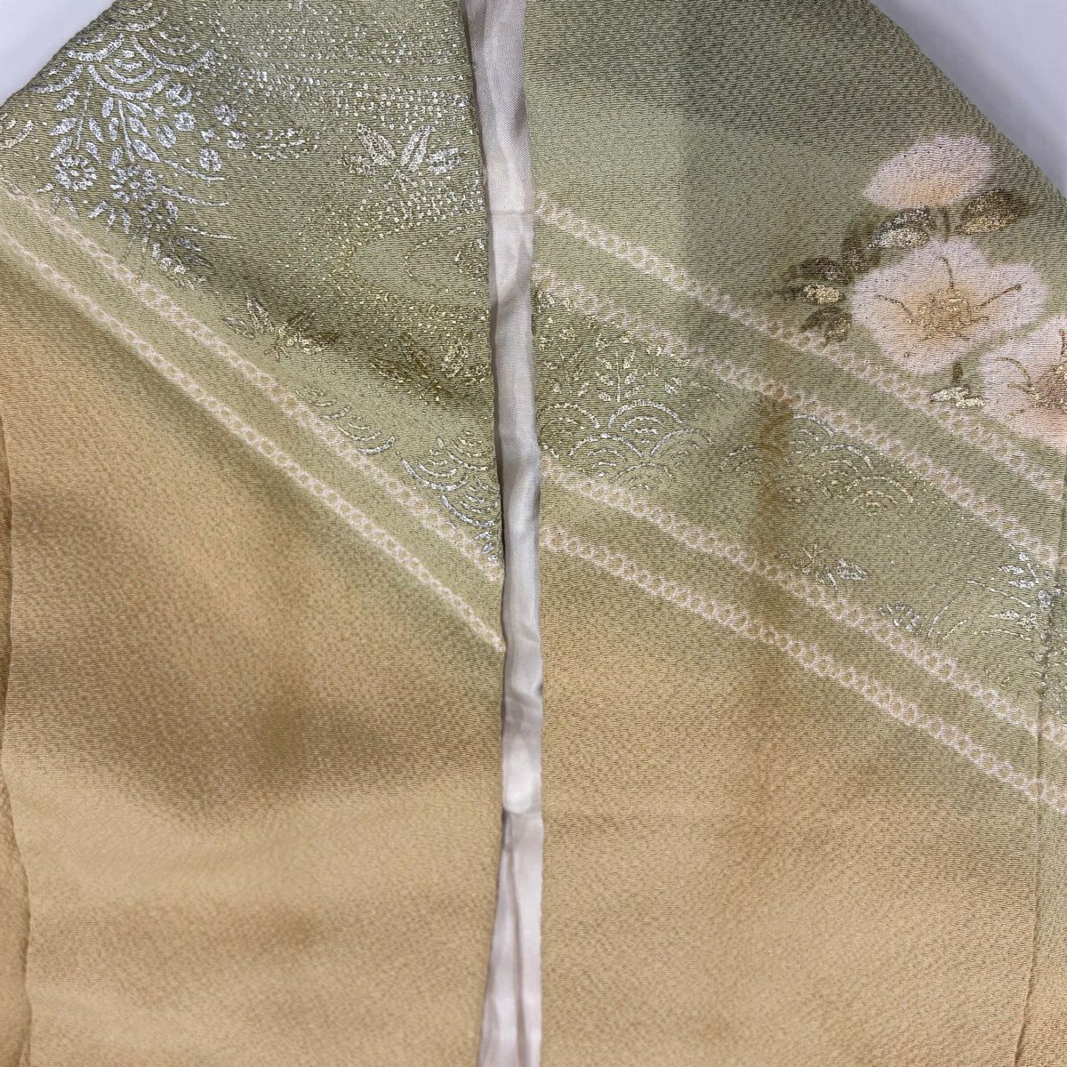 訪問着 身丈162cm 裄丈65.5cm M 袷 草花 霞 刺繍 金彩 灰緑 正絹 秀品