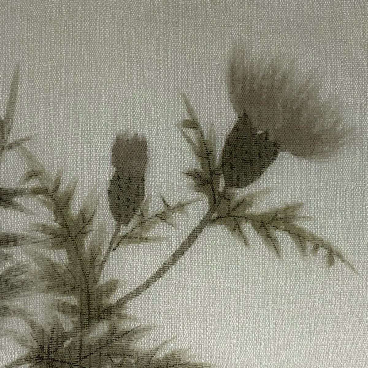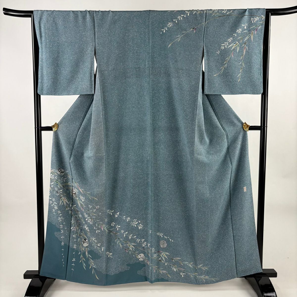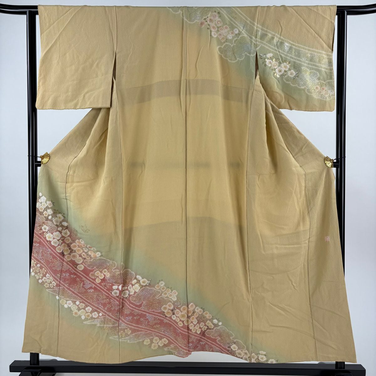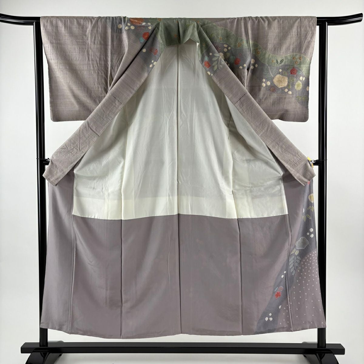 訪問着 身丈162cm 裄丈65.5cm M 袷 草花 霞 刺繍 金彩 灰緑 正絹 秀品