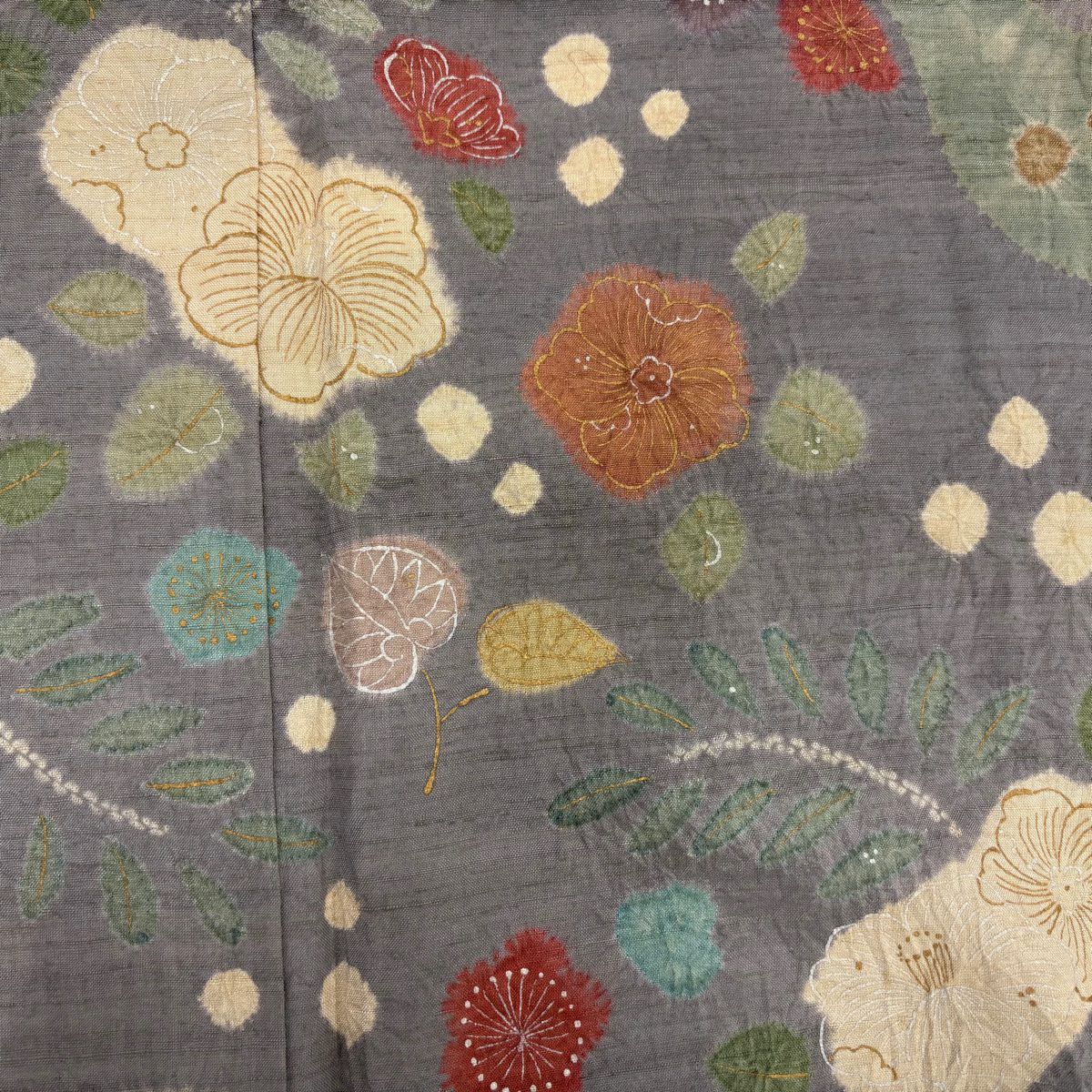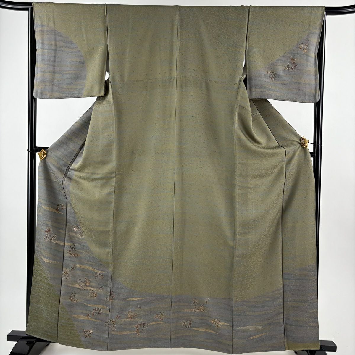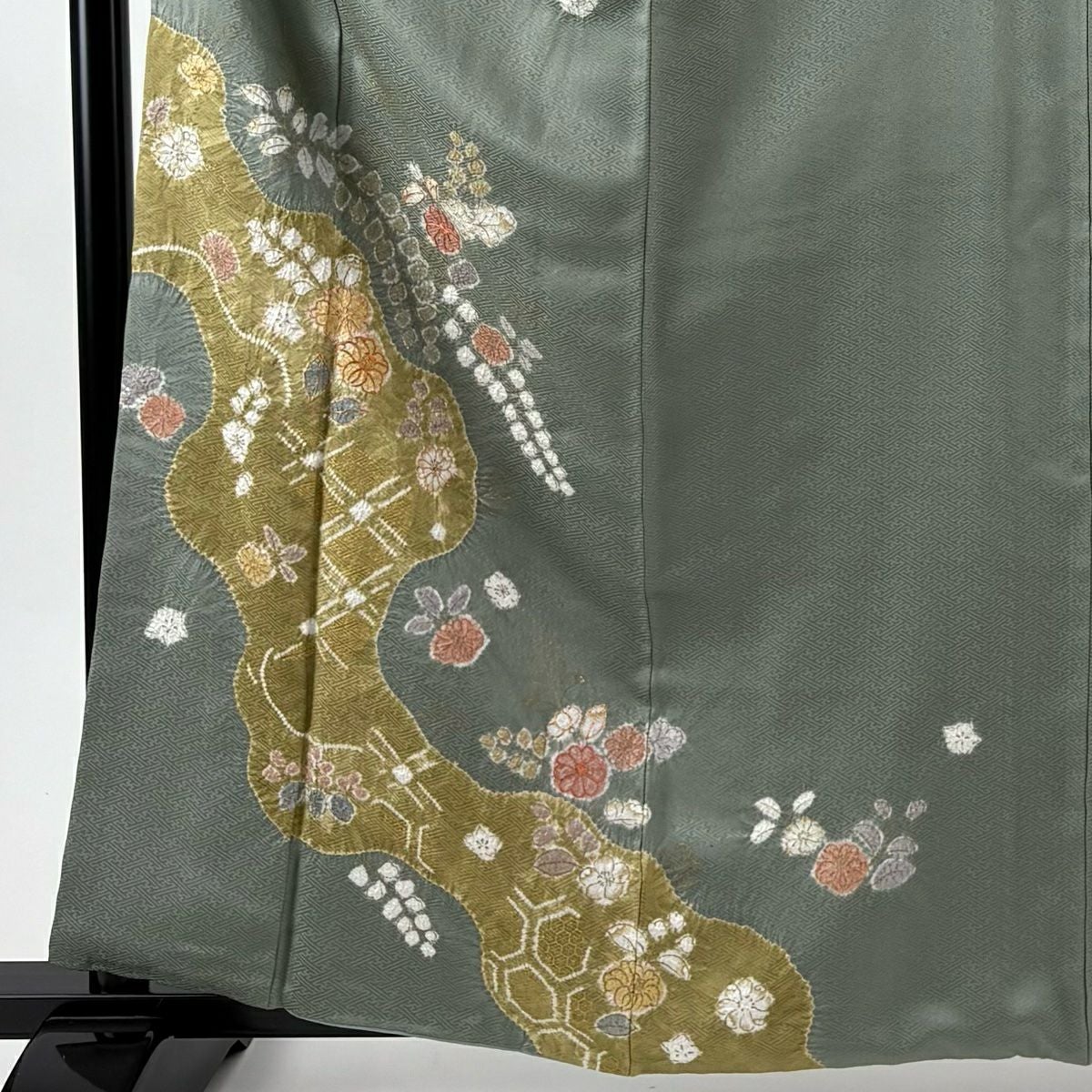 訪問着 身丈162cm 裄丈66cm M 袷 草花 道長取り 金彩 絞り 灰緑 正絹 秀品