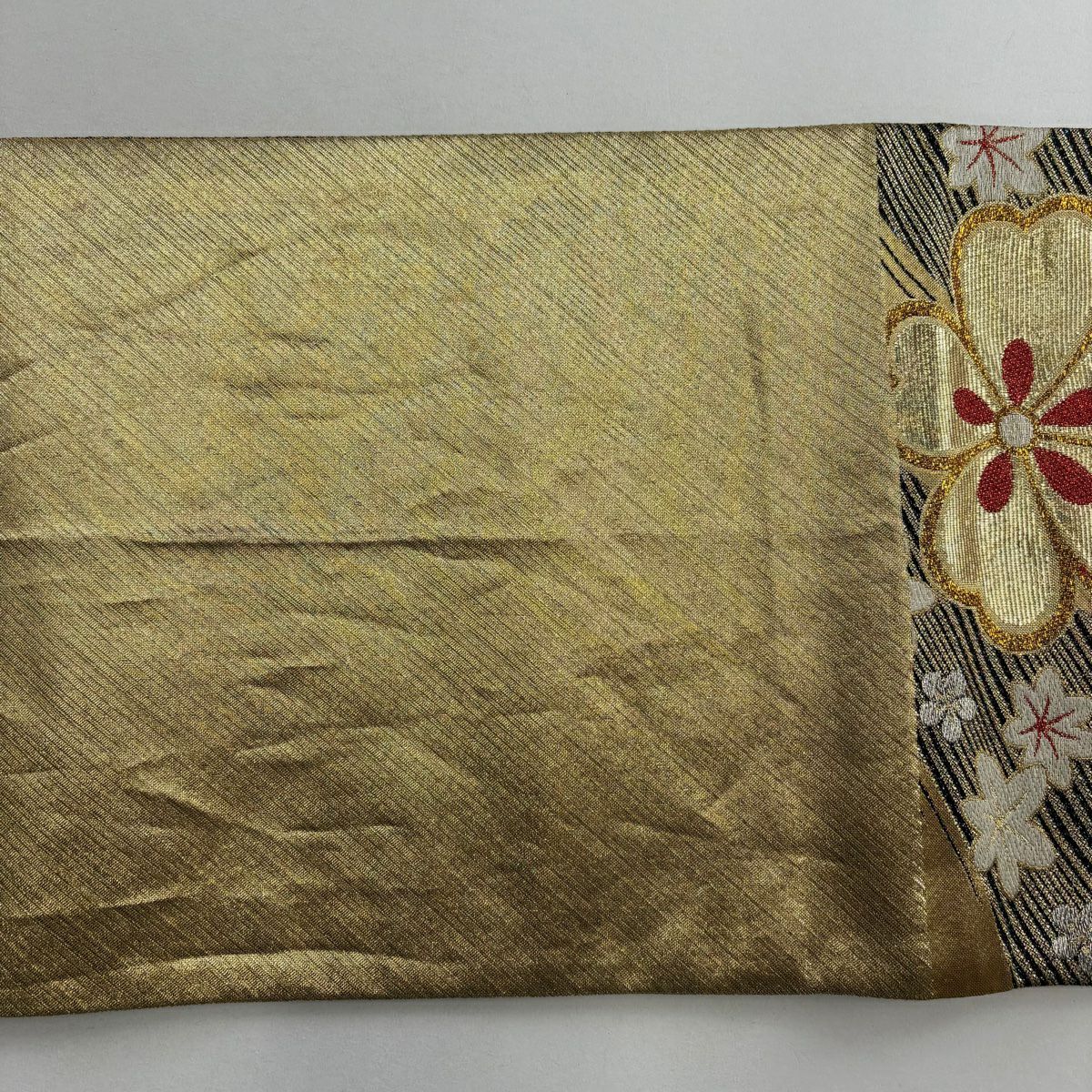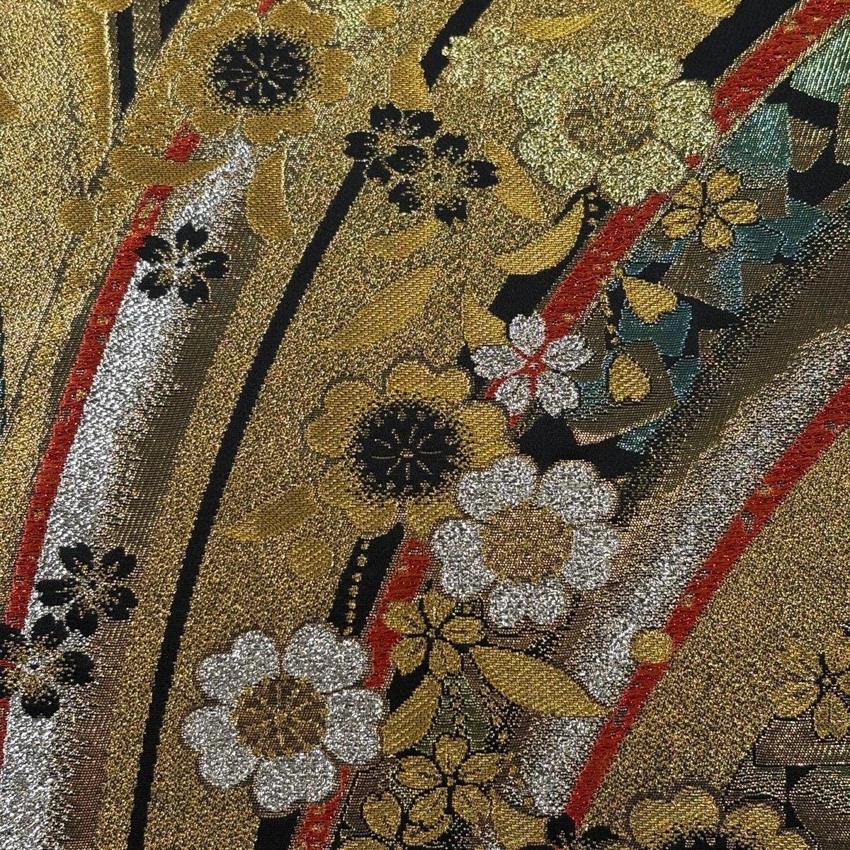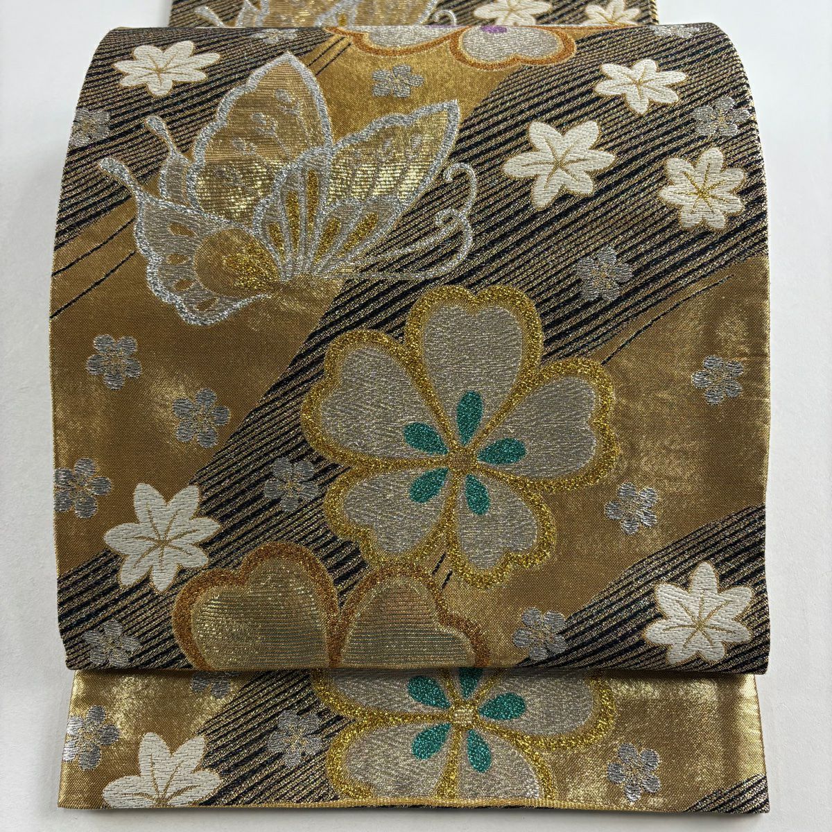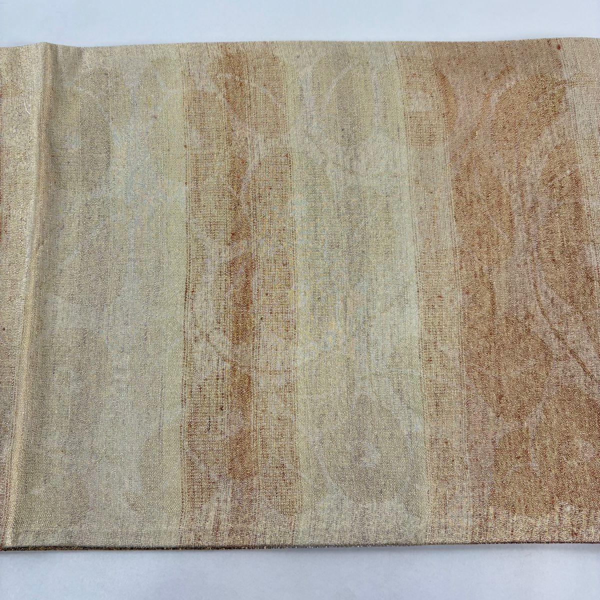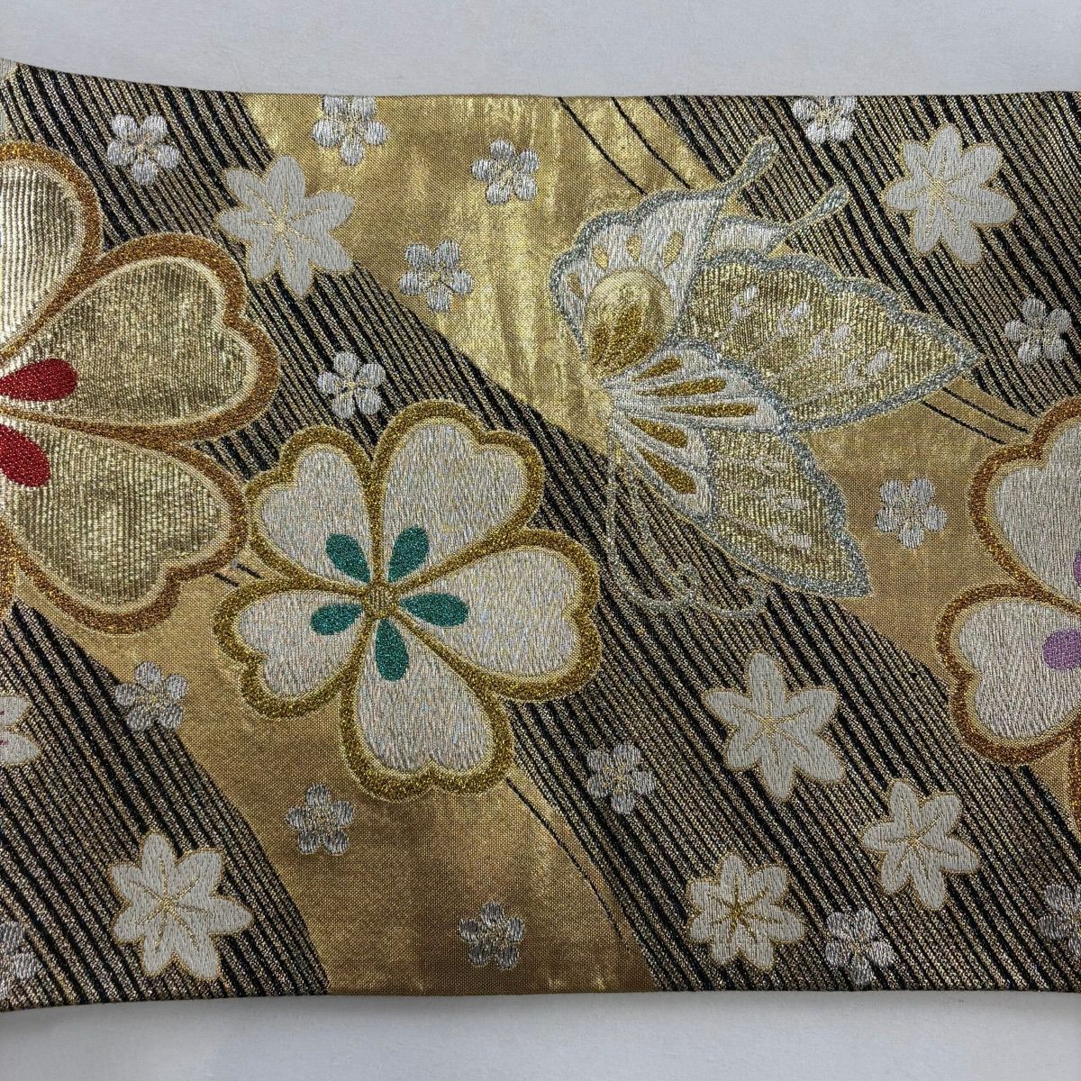 【美品】 袋帯 秀品 草花 段縞 箔 金色 全通 正絹