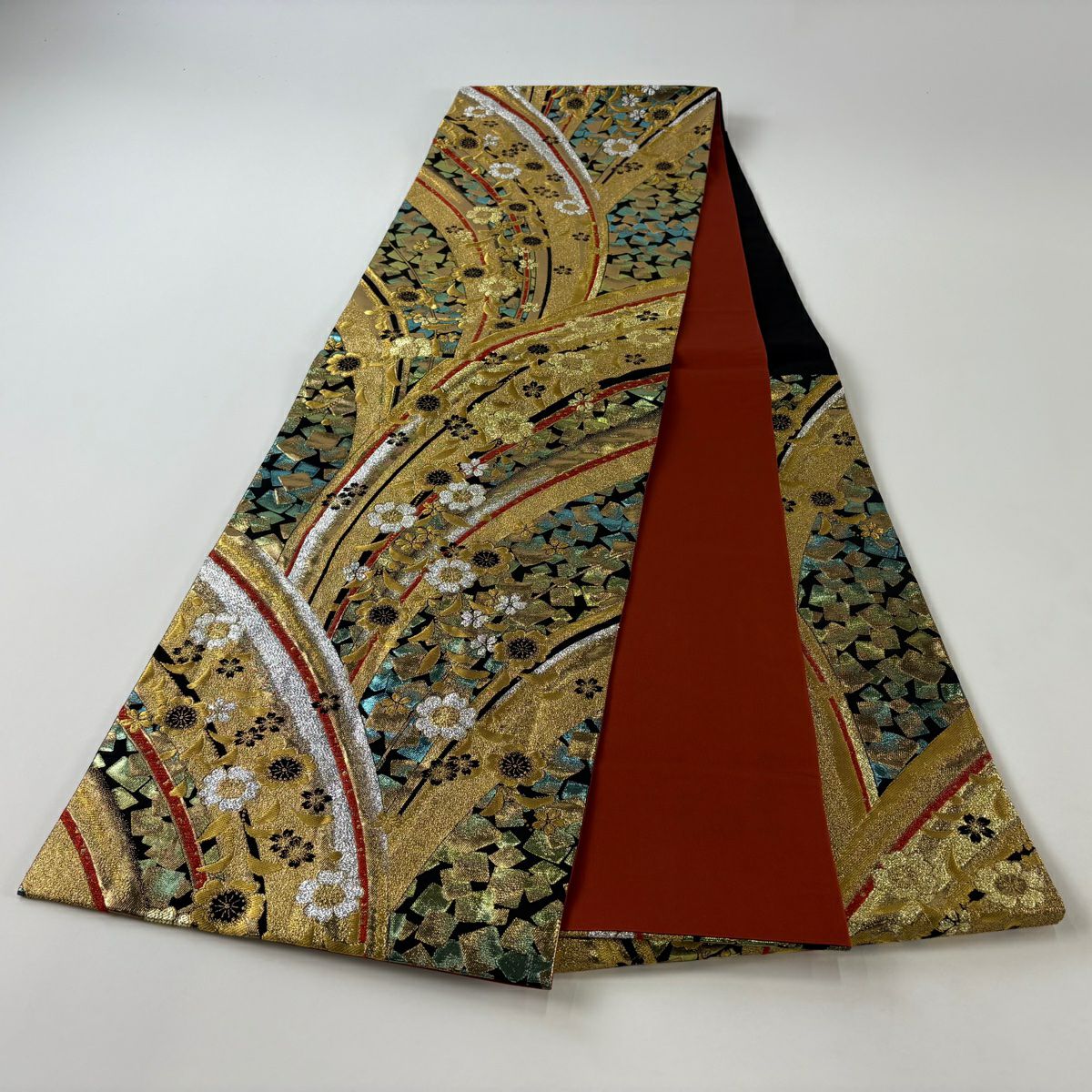 【美品】 袋帯 秀品 加納幸 落款あり 楓 梅 箔 金糸 赤茶 お太鼓柄 正絹