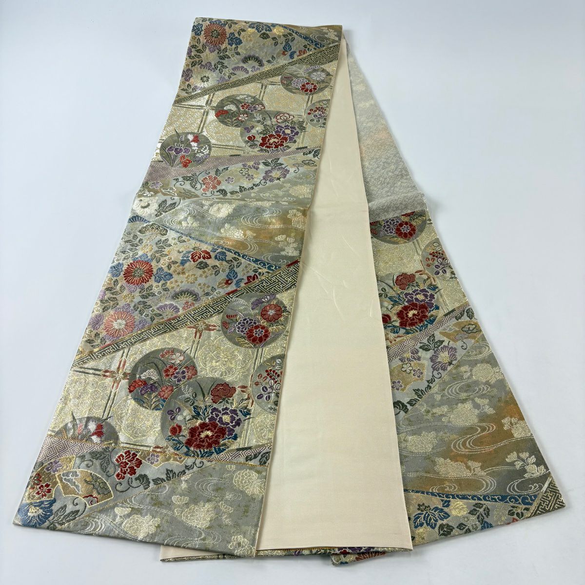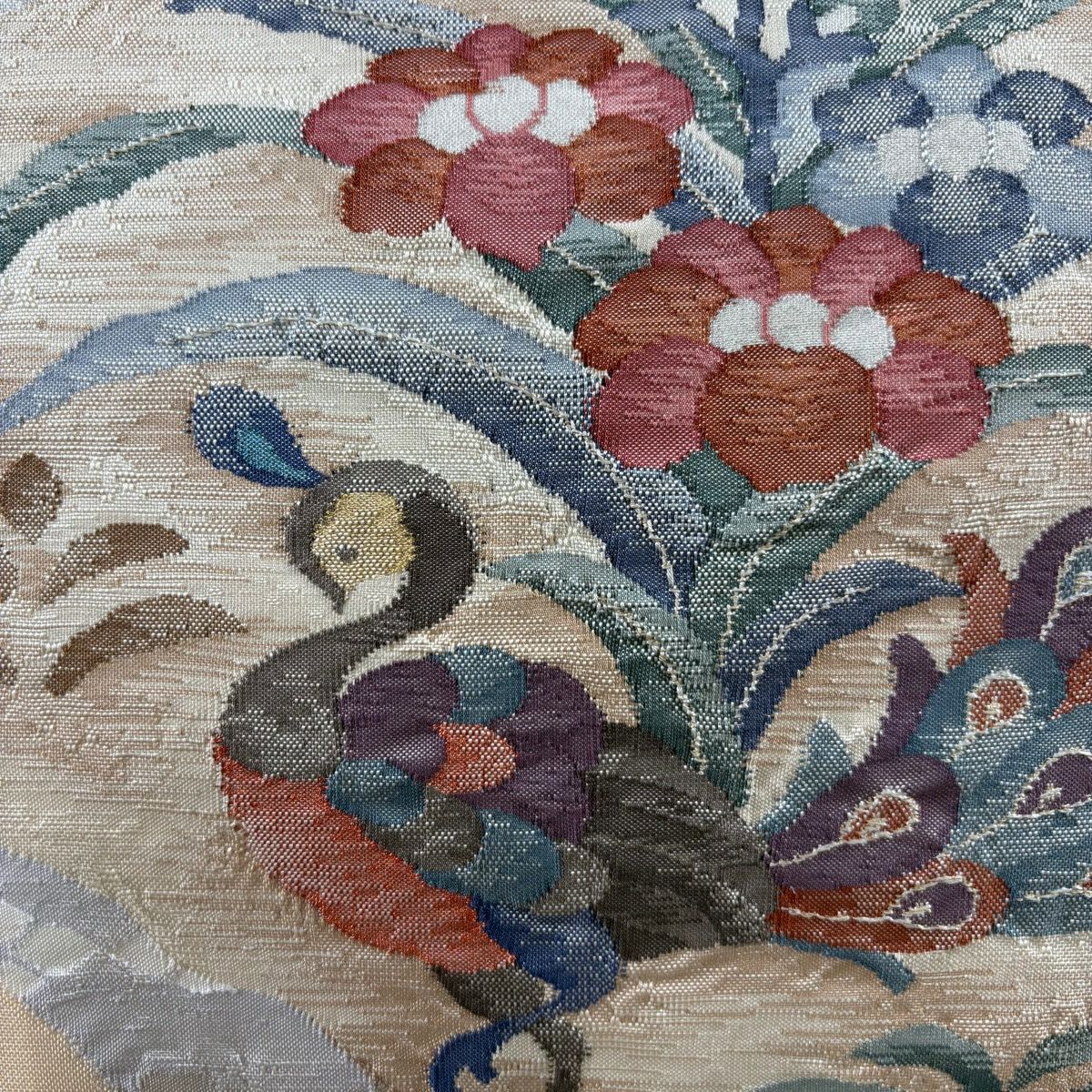【美品】 袋帯 秀品 丸紋 草花 箔 刺繍 ベージュ 六通 正絹