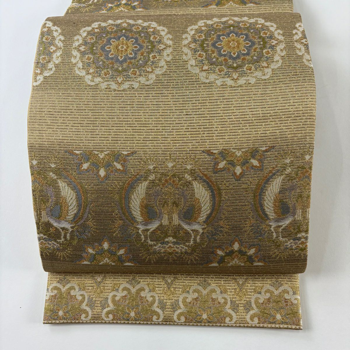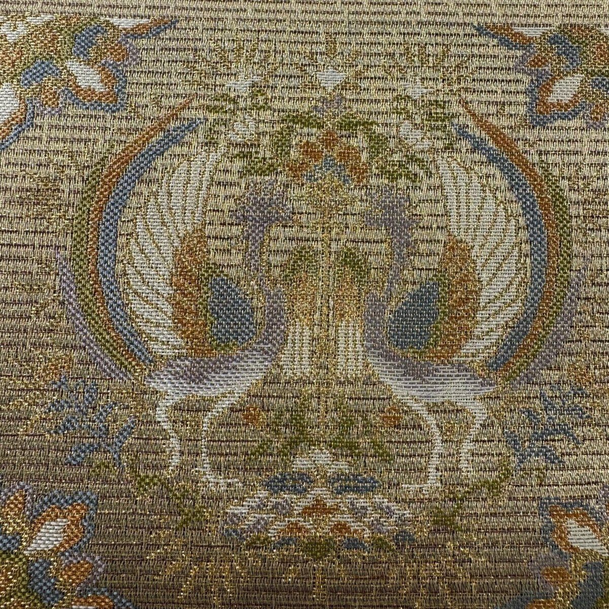 【美品】 袋帯 秀品 華文 向かい鳥 金糸 金色 六通 正絹