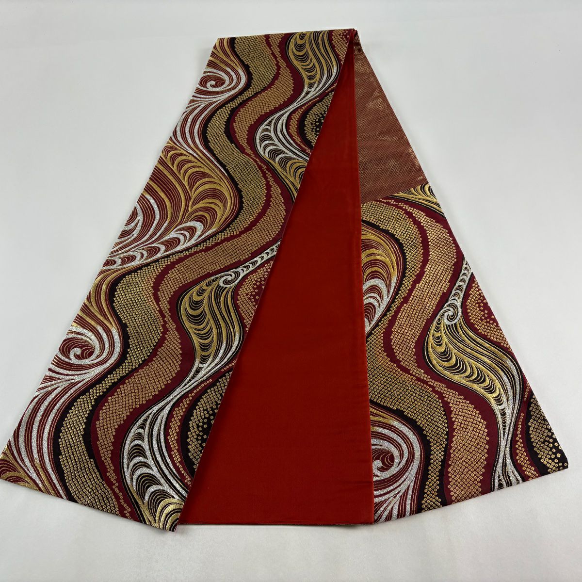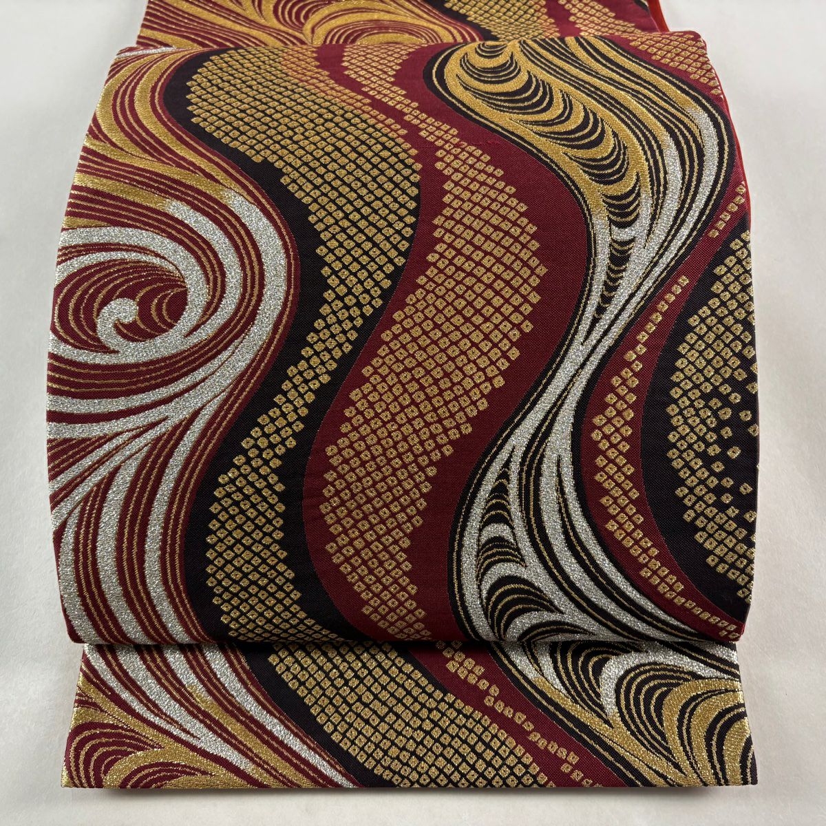 【美品】 袋帯 秀品 鈴乃屋 波頭 幾何学 箔 金糸 小豆色 六通 正絹