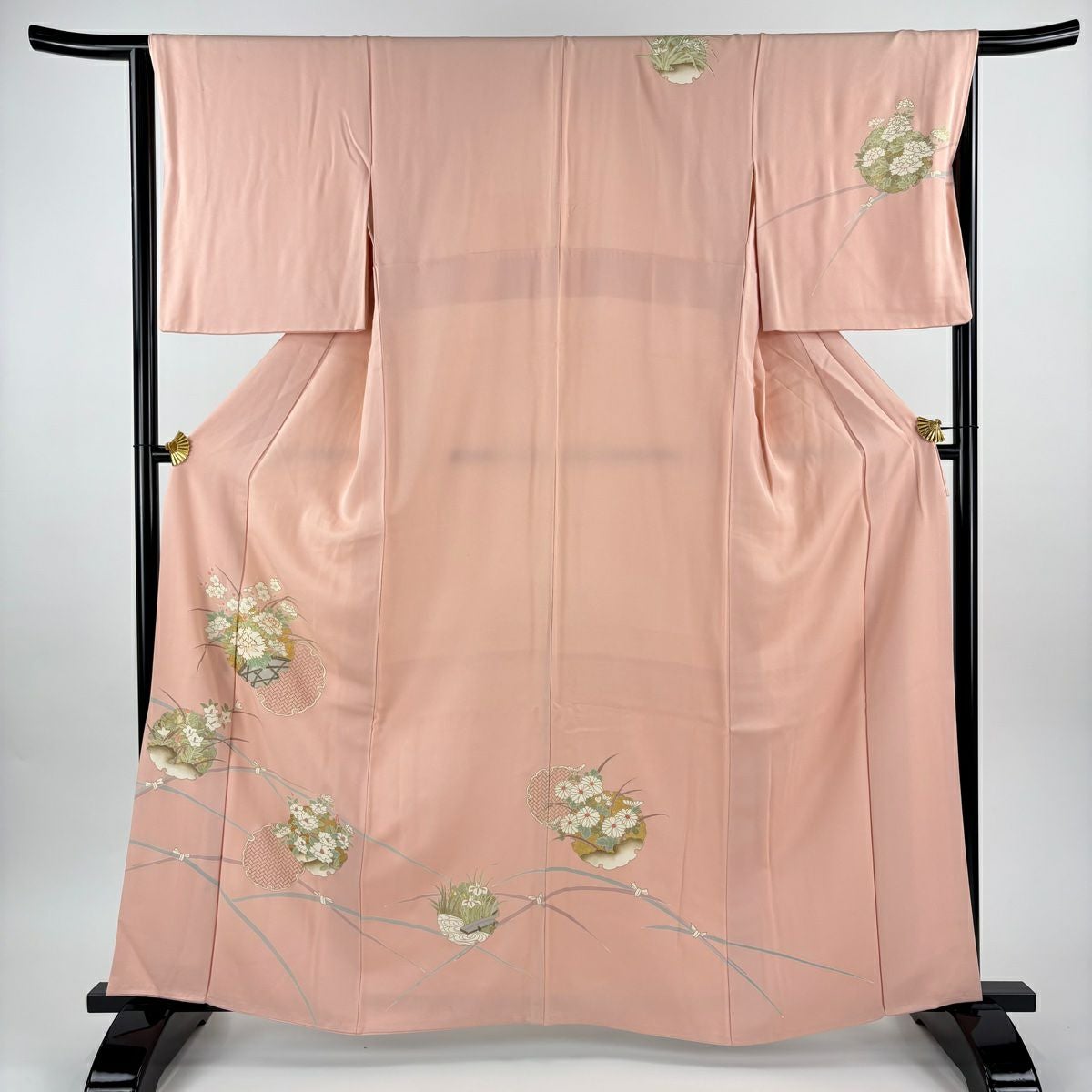 訪問着 身丈159.5cm 裄丈68cm L 袷 向かい鳥 草花 金糸 金彩 ピンクベージュ 正絹 秀品