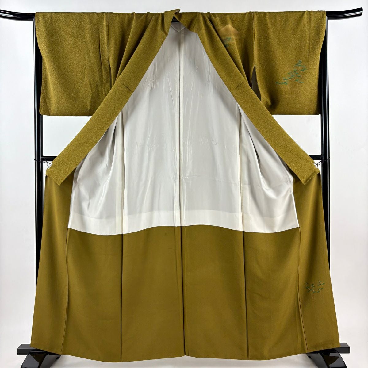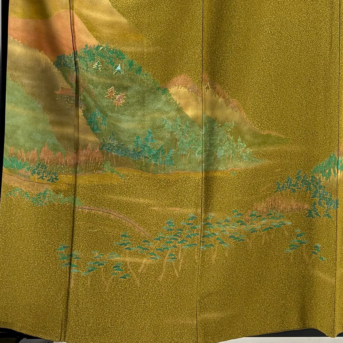 付下げ 身丈161cm 裄丈66cm M 袷 山並み 樹木 金彩 金糸 鶯色 正絹 美品 秀品 一つ紋