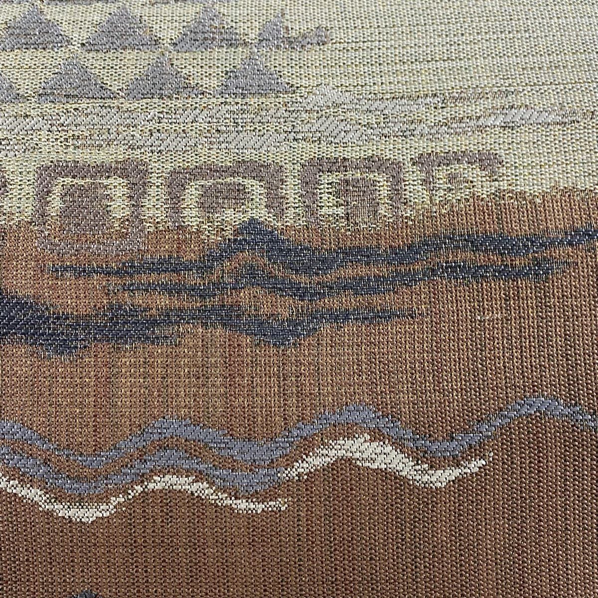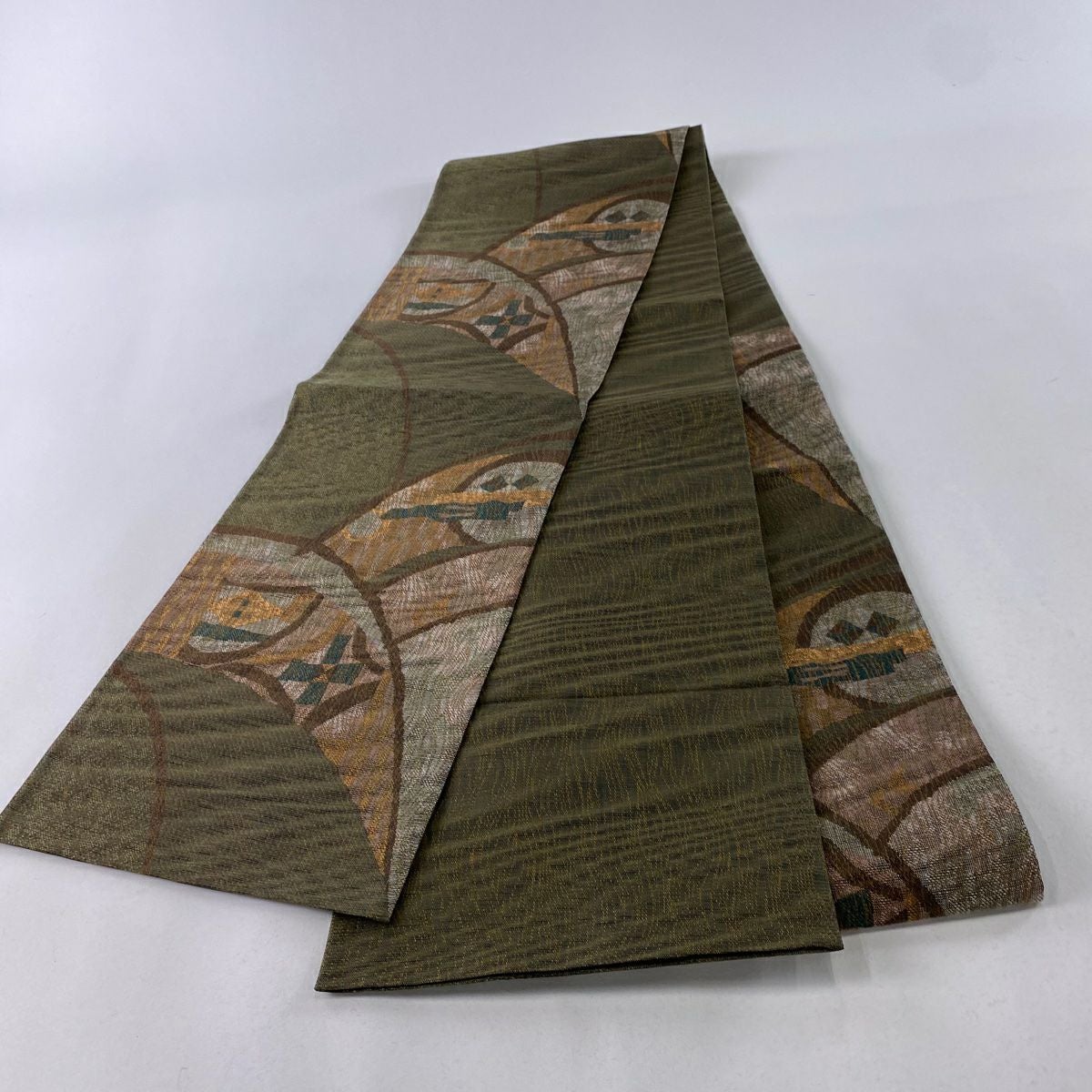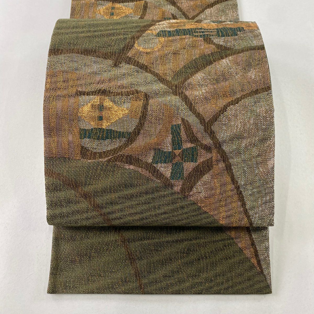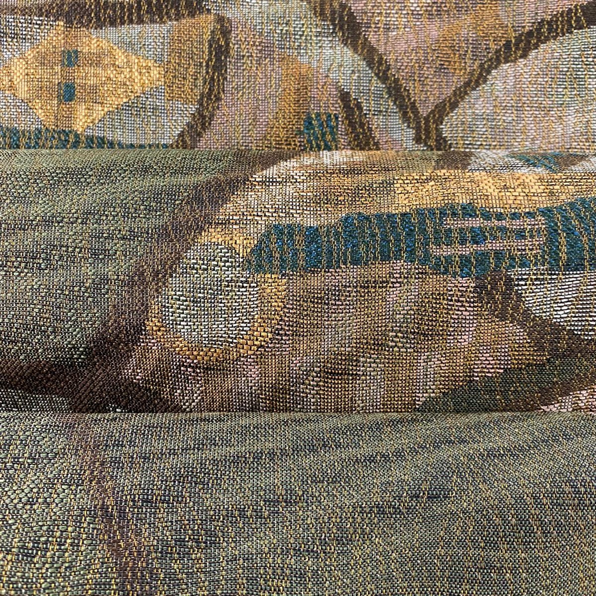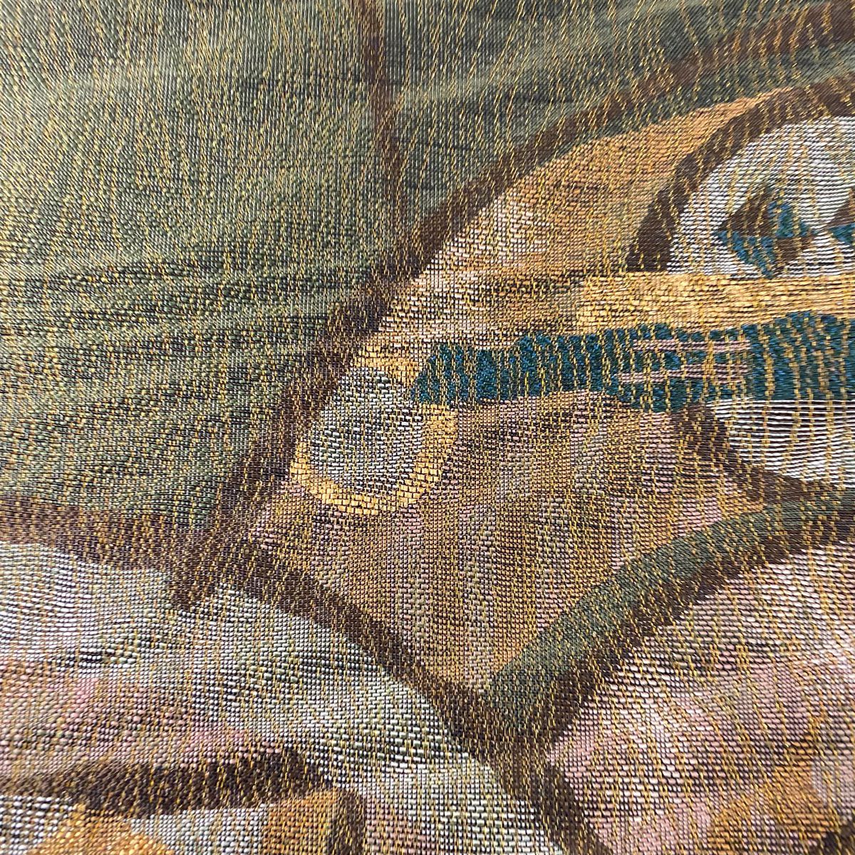 袋帯 美品 秀品 幾何学 金糸 箔 茶緑色 六通 正絹