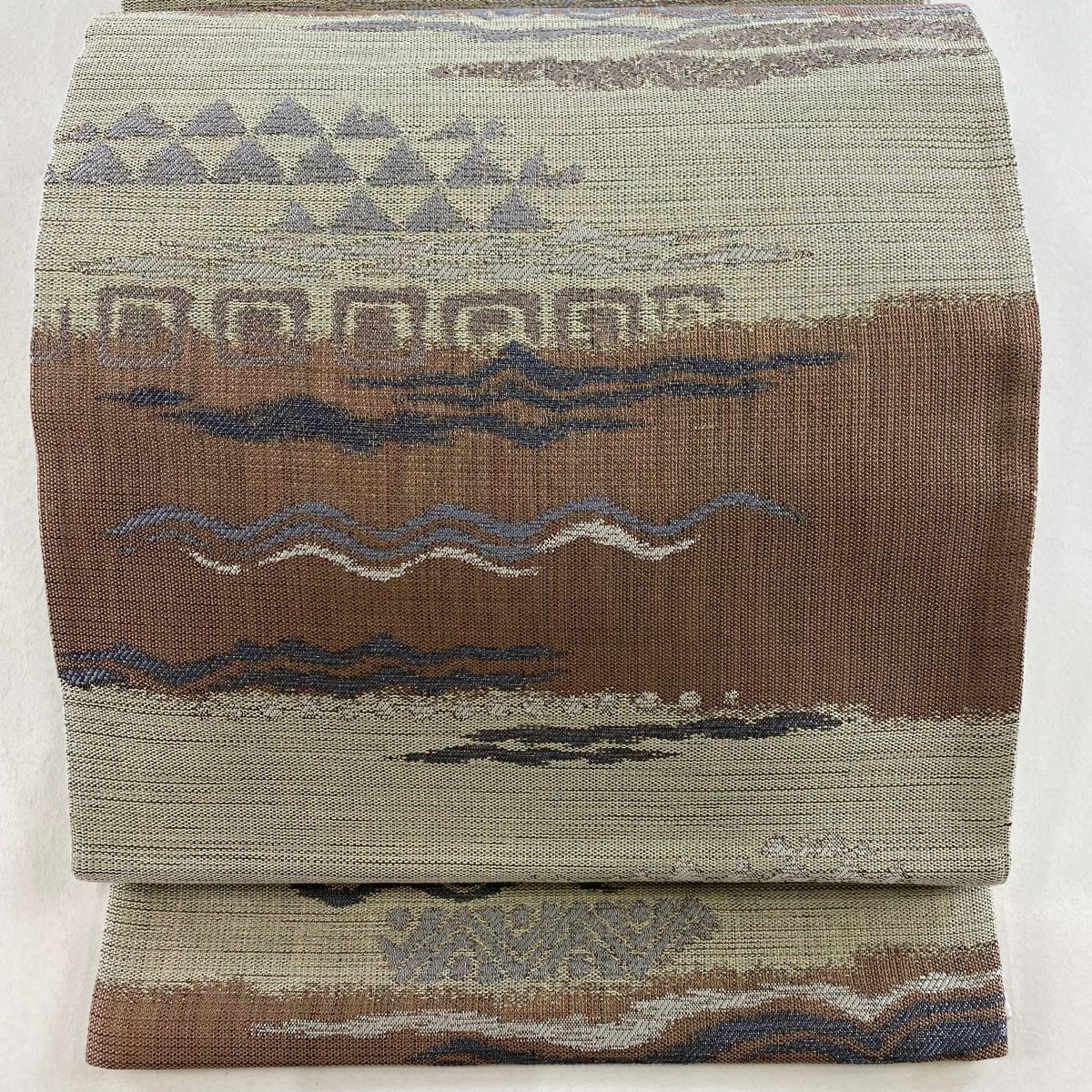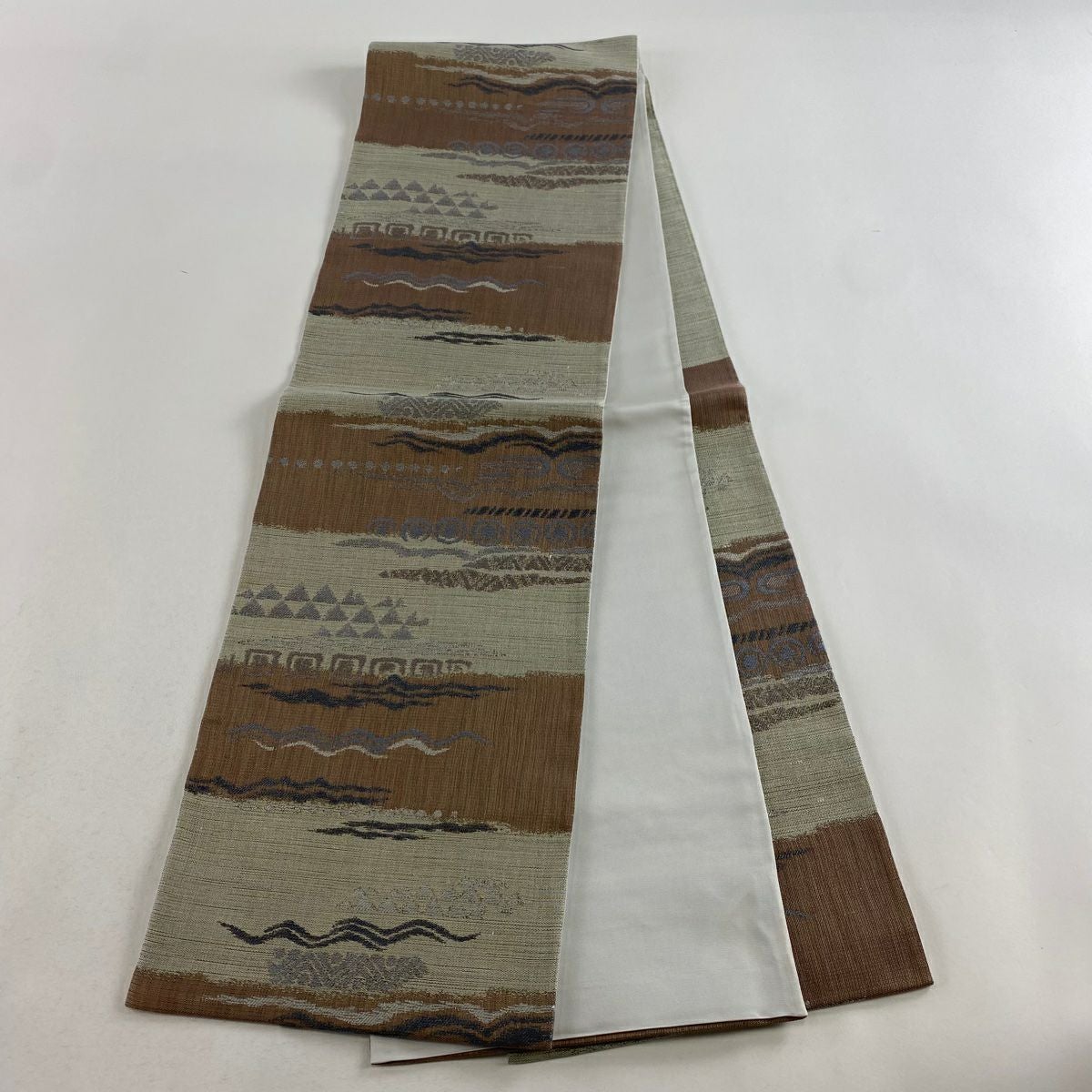 袋帯 美品 秀品 縞 幾何学模様 灰緑 全通 正絹