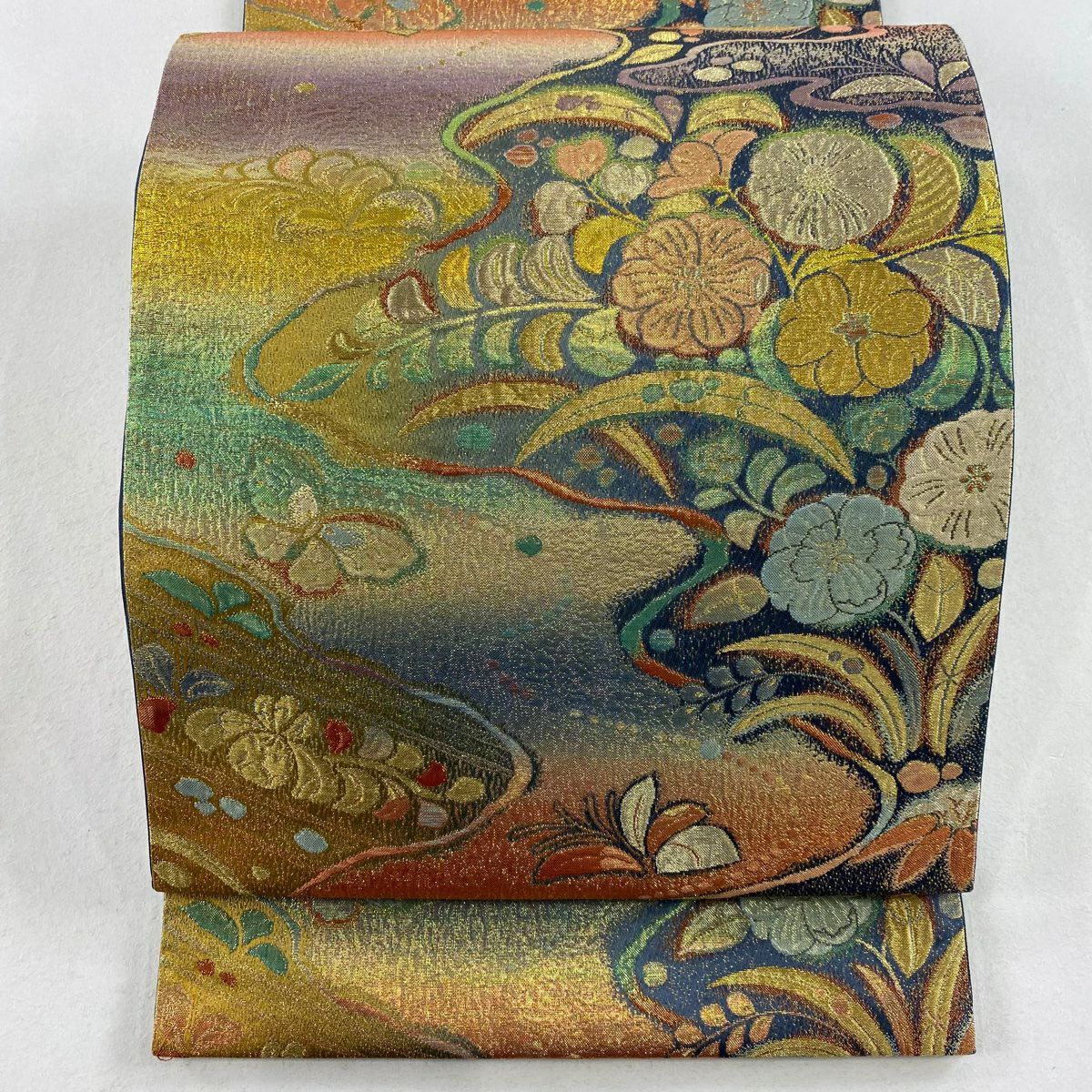 袋帯 美品 秀品 片輪車 草花 唐織 金糸 金色 六通 正絹