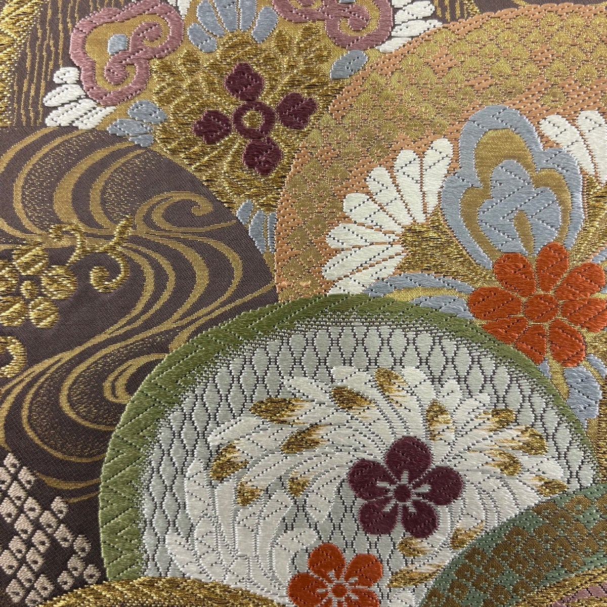 【美品】 袋帯 秀品 落款あり 本家加納 関西仕立て 扇面 鶴 金銀糸 箔 小豆色 六通 正絹