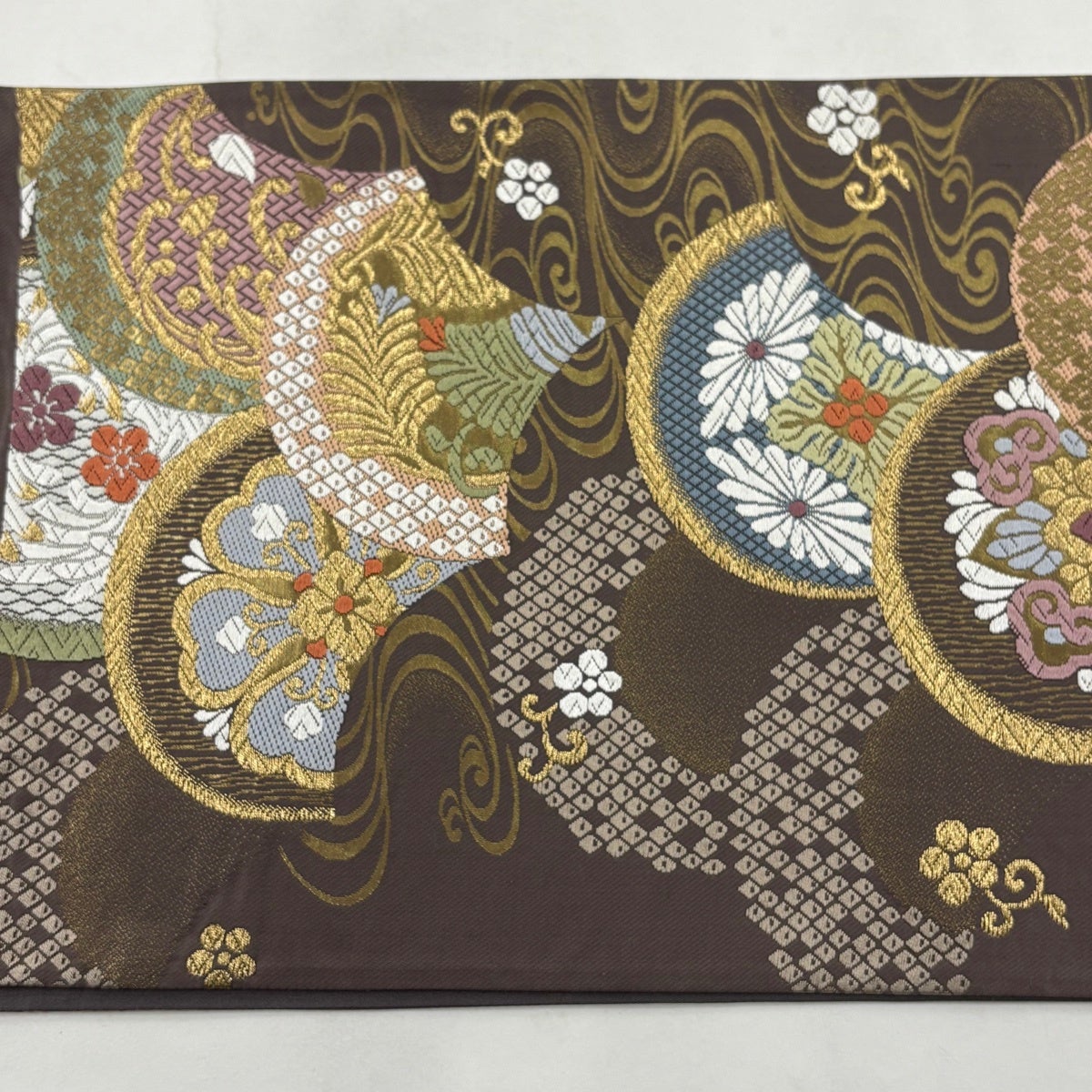 【美品】 袋帯 秀品 華文 流水 金糸 唐織 灰茶 六通 正絹