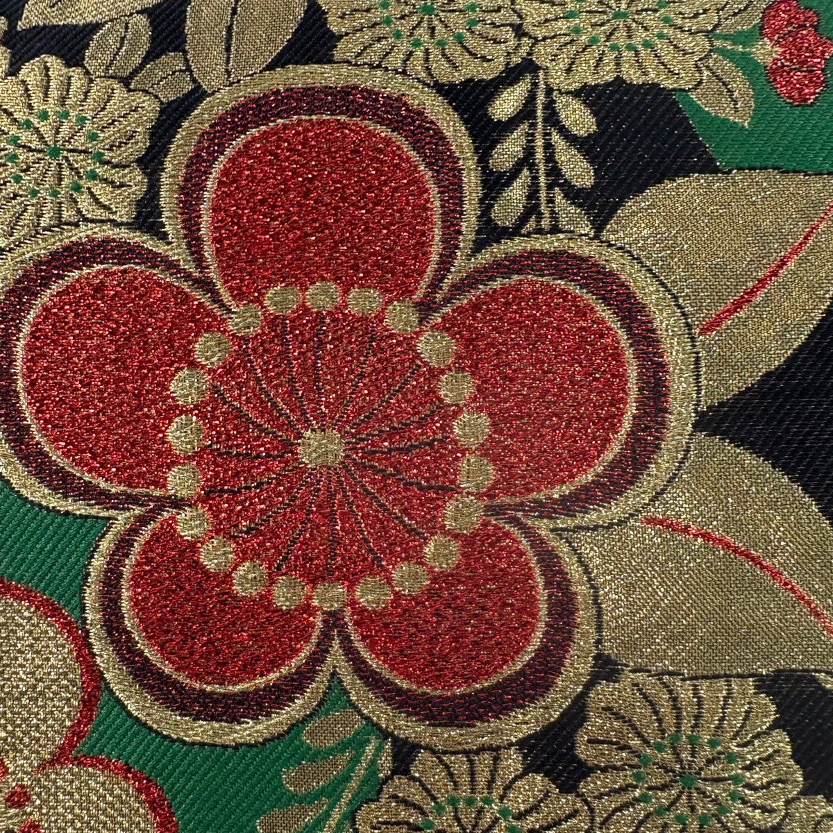 【美品】 袋帯 秀品 振袖向き 梅 草花 金糸 箔 緑 六通 正絹