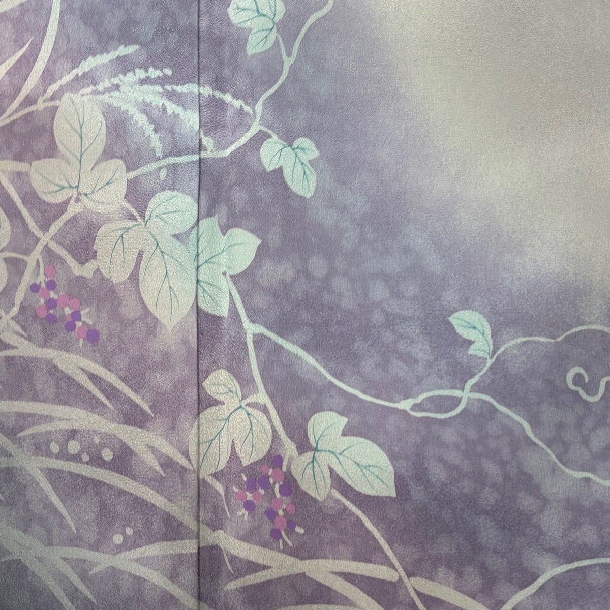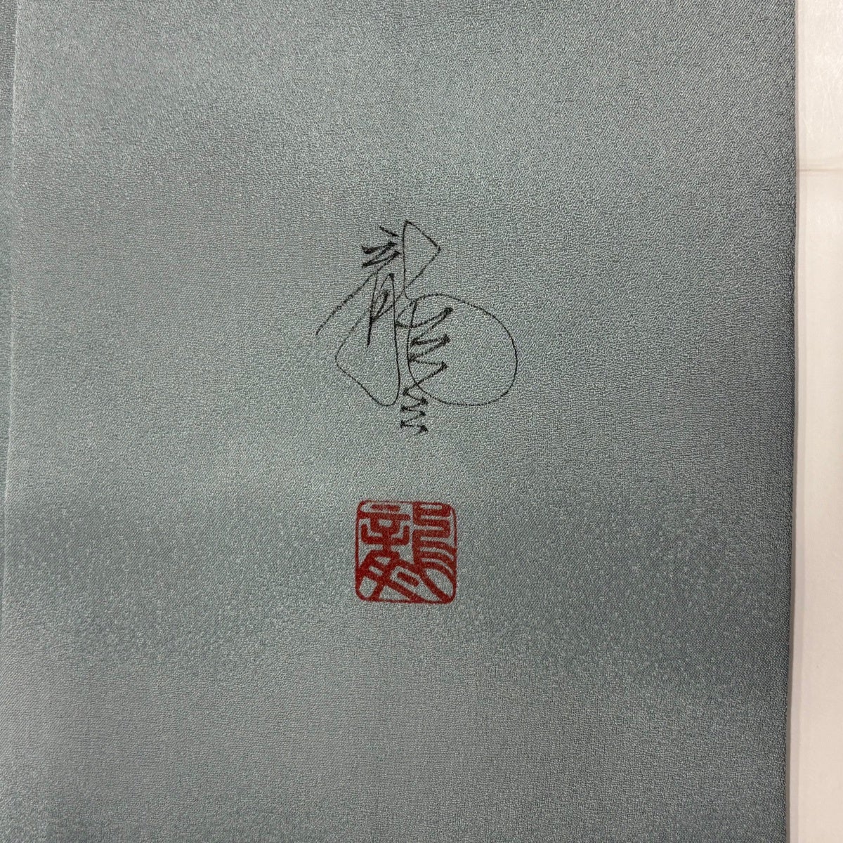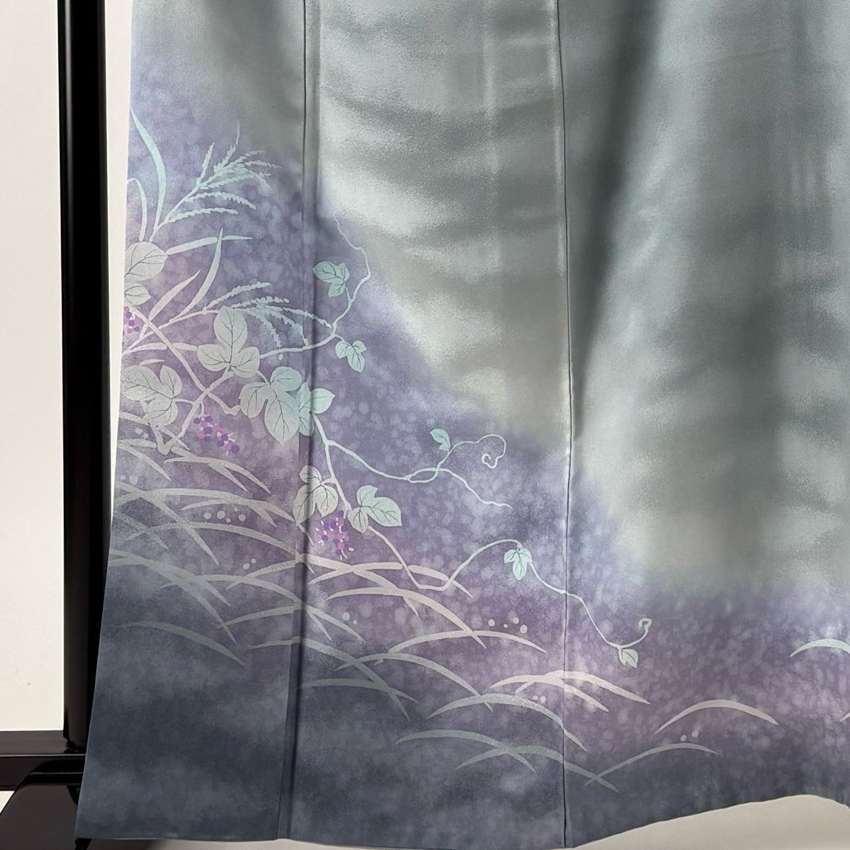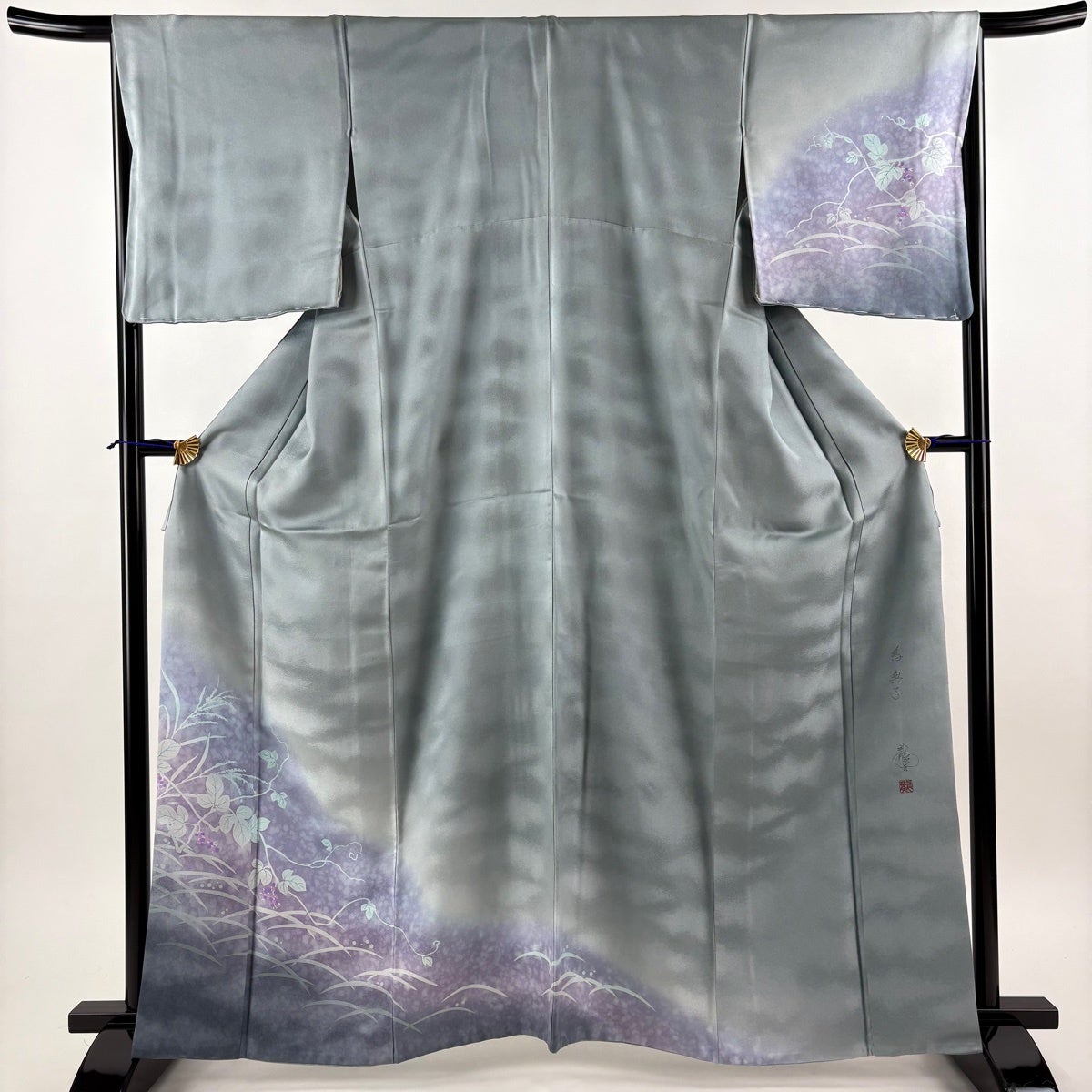 【美品】 付下げ 身丈164cm 裄丈66.5cm M 袷 落款あり 葡萄 芝 ぼかし 青灰色 正絹 秀品
